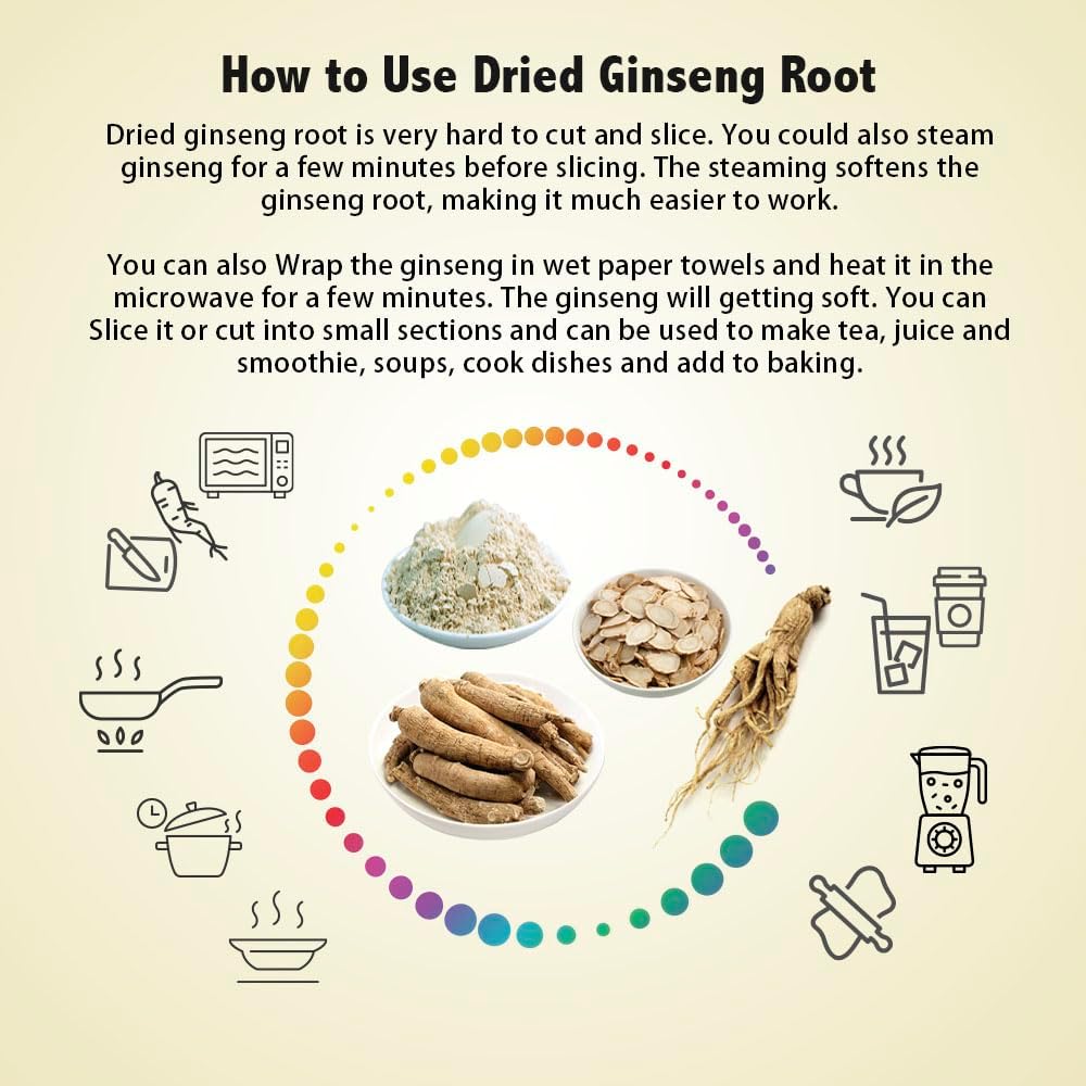 Feeling tired? Ginseng has been used for thousands of years to boosts your body immunity & energy. Include it in your diet today! Ginseng is a plant whose roots have been prized for thousands of years for their health benefits. How to use dried ginseng roots? Ginseng root is typically chewed or stewed in water to make a tea or soup. You could also steam ginseng for a few minutes before slicing. The steaming softens the root, making it much easier to work. You can also Wrap the ginseng in wet paper towels and heat it in the microwave for a few minutes. The ginseng will getting soft. You can Slice it or cut into small sections and can be used to make tea, soups, cook dishes and add to baking.