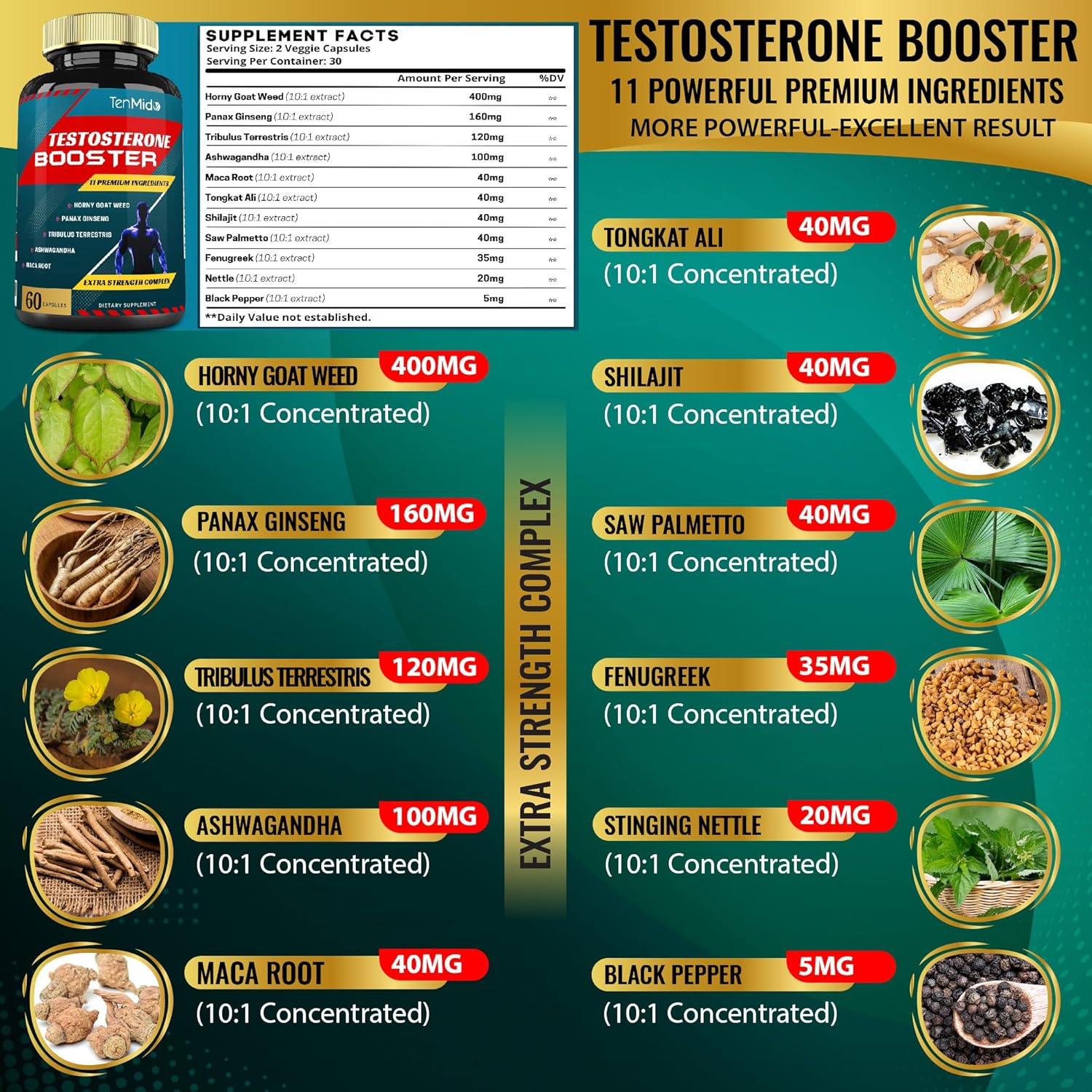 ❤️ Advanced Formula: Testosterone Booster Supplement Extract Capsules combination with 11 powerful herbs problematic ingredients: Horny Goat Weed, Panax Ginseng, Tribulus Terrestris, Ashwagandha, Maca Root, Tongkat Ali, Shilajit, Saw Palmetto, Fenugreek, Nettle, Black Pepper. With the special optimized formula, our product has been shown to be one of the most advantageous herbs, highest absorption and bioavailability for your overall health.