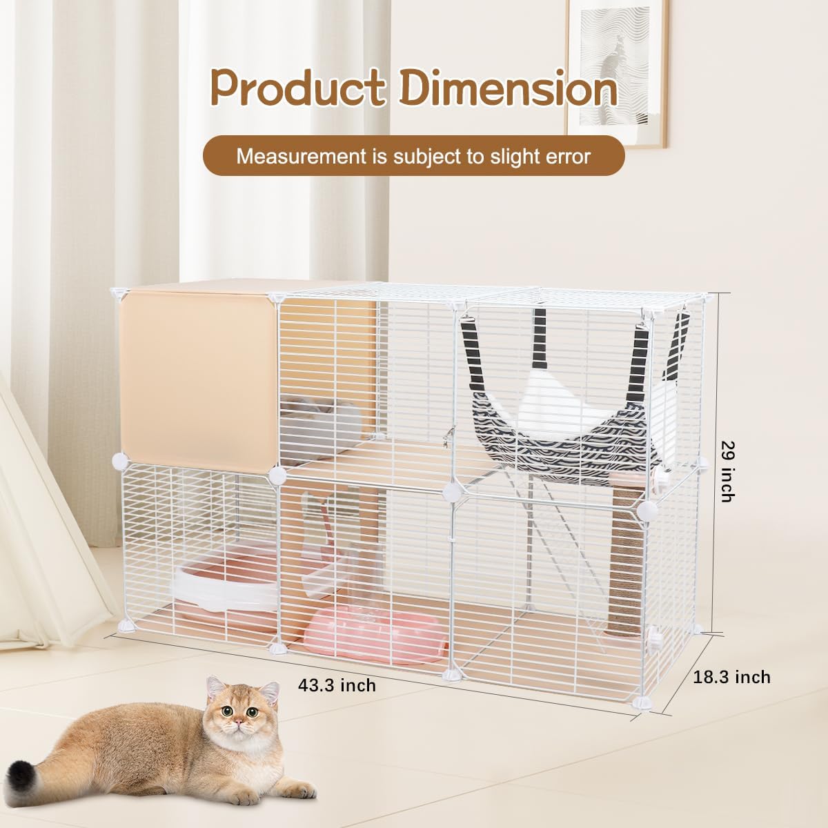2-Tier Cat Cages Indoor, DIY Metal Wire Cat Kennel Enclosure Pet Home Small Animal House Detachable Cat Crate Indoor Catio with Cat Bed Hammock Scratcher Bowl Cat Litter Box Stairs