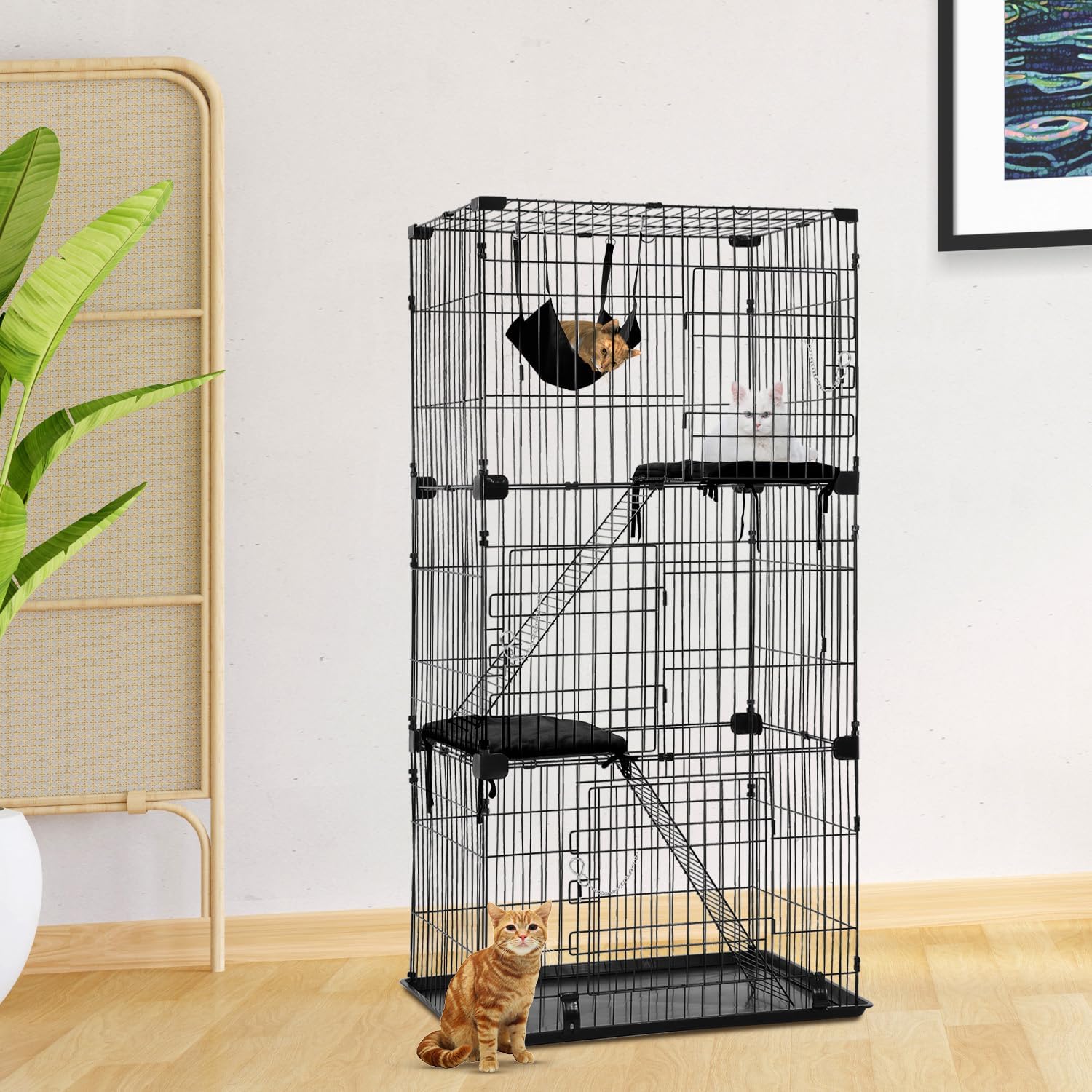 😺 Activity Center:Apart from 3 tiers and 2 ramps, this cat cage is also equipped with a free hammock, 2 cat resting platforms, and 2 metal ladders, just like an amusement park for the lovely cats; small pets like guinea pigs, rabbits, etc.dog playpen pet playpen puppy playpen.Cat cage cat playpen cat crate