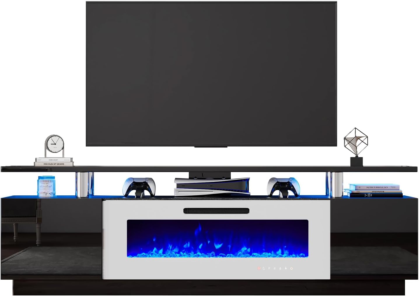 80″ Fireplace TV Stand, Modern High Gloss Finish Media Console with 40″ Electric Fireplace, Open Storage Entertainment Center for TVs Up to 90″ with LED Lights, Black/White