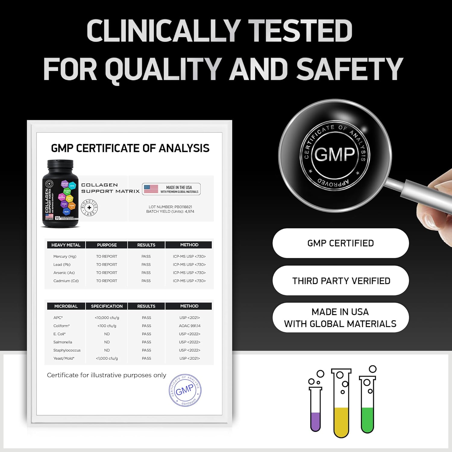ADVANCED MULTI COLLAGEN SUPPLEMENTS. Includes type I II III V X hydrolyzed collagen peptides, 1,000 mg bovine collagen, chicken broth, eggshell membrane collagens, and fish collagen (marine collagen) supporting skin health, elasticity & resilience.