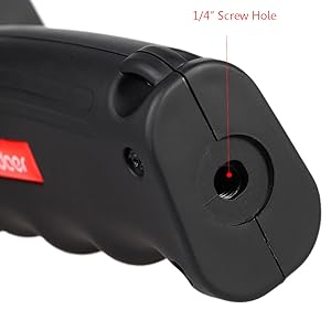 Bottom with 1/4″ screw hole to attached to tripod, monopod or other devices.