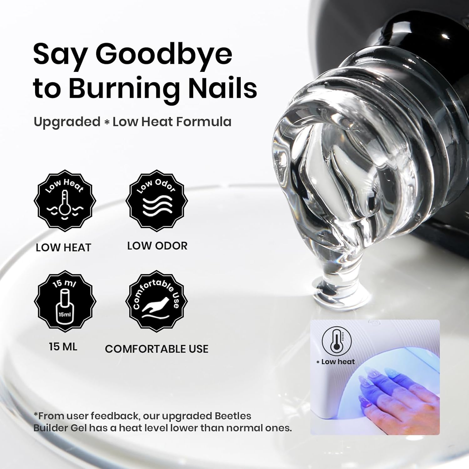 Flexible and durable: Beetles Gel is made of a low-heat upgraded formula, which reduces the stinging sensation when the lamp is illuminated. There is no need to retract your hands during the lamp illumination process. The durable builder gel for nails can last longer, giving you natural, strong, flexible, and light nails. Proper use can last for more than 30 days.
