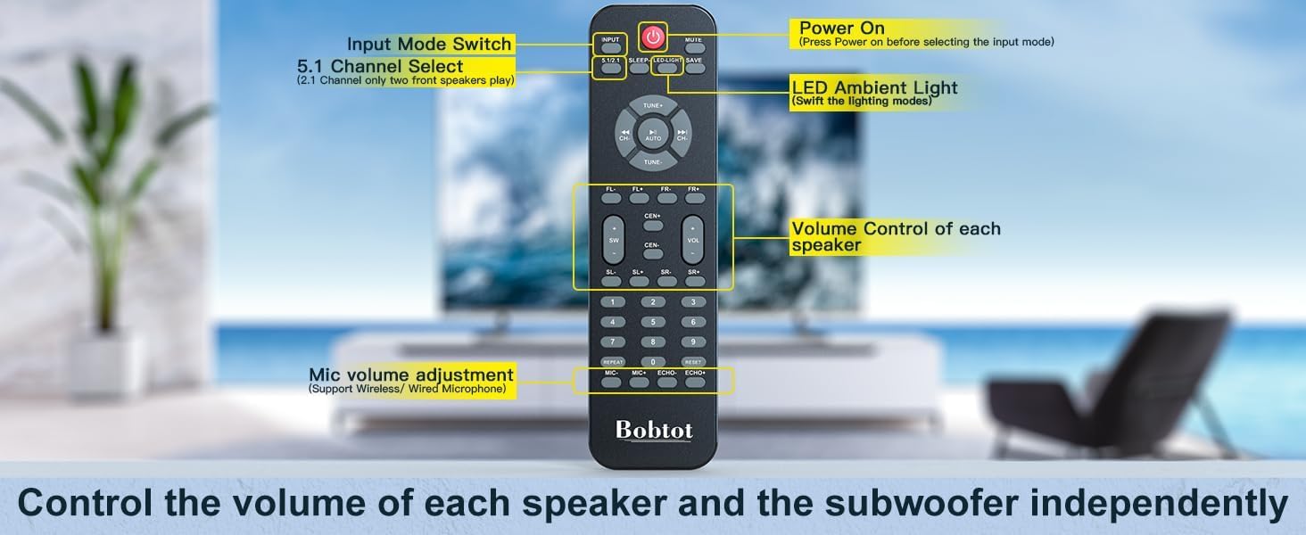 Remote Control – Take full control of your audio experience. In addition to front-panel buttons, our system includes a comprehensive remote control. Adjust speaker volumes, control the subwoofer, and even toggle the LED lights with ease