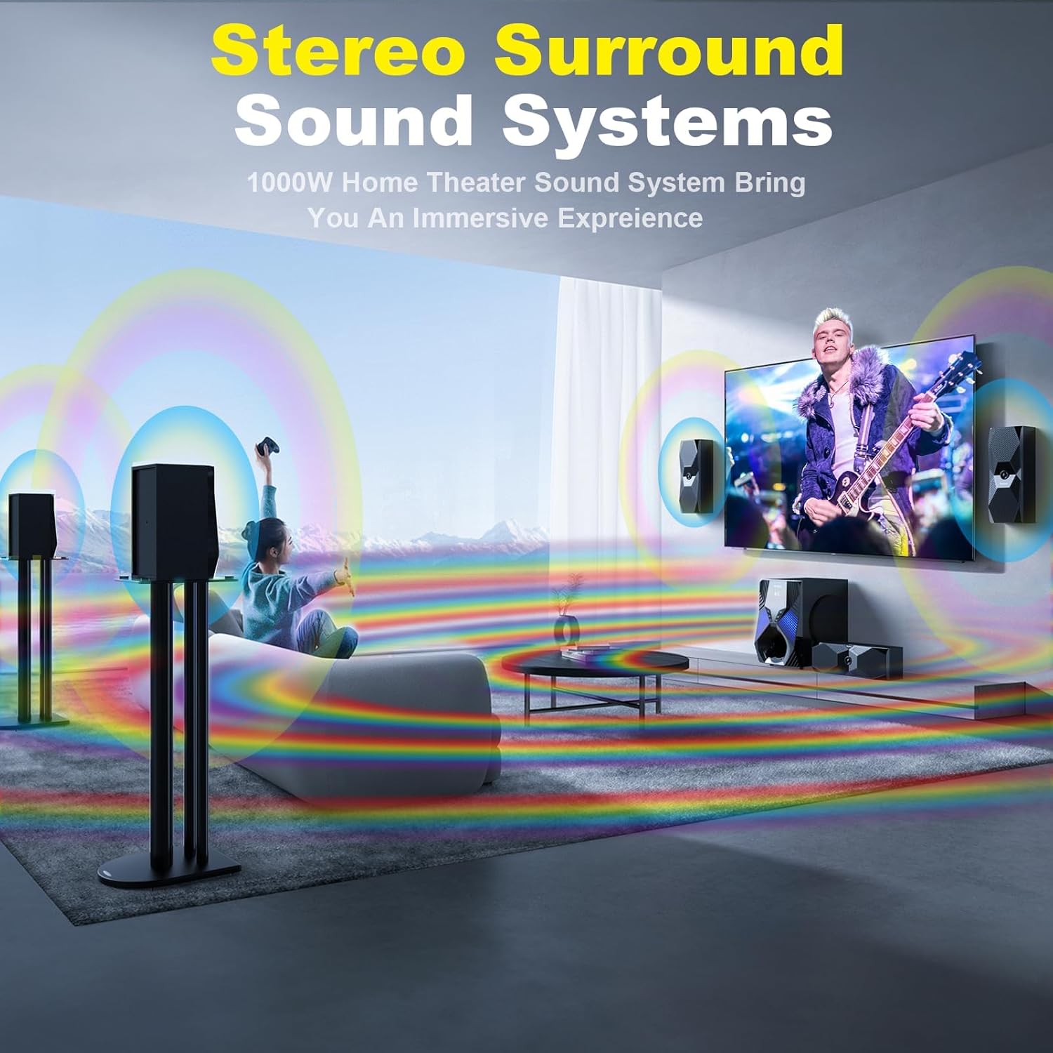1000 Watts Peak Power – The home theater systems deliver 1000 watts peak power surround sound. With an 8-inch subwoofer featuring a built-in receiver, it provides stereo sound with a well-balanced midrange, crisp treble, and punchy bass. Immerse yourself in a cinematic experience with high volume and rich bass