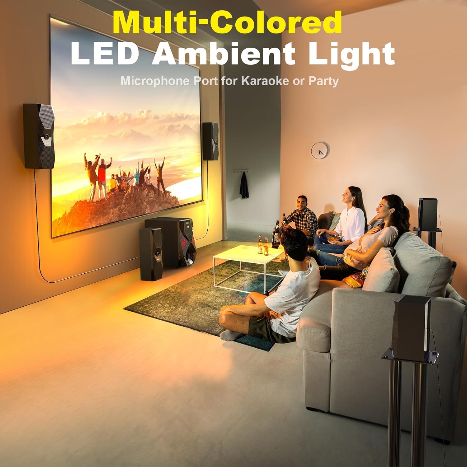 Dynamic Lighting and Karaoke Fun – The surround sound system for tv with subwoofer have 6 modes of multi-colored flashing lights, enhancing your entertainment experience. It has 2 MIC Inputs for karaoke, you can sing a song with it. Perfect for parties with friends at home