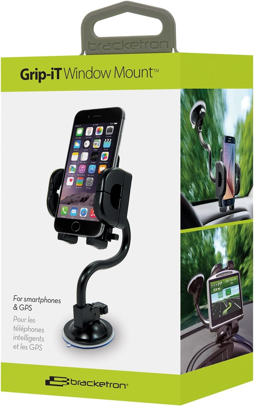 Get the ultimate in flexibility and functionality for mounting your mobile device in your vehicle. Simply clean the inside of your windshield, bend the arm to adjust it to your desired angle and then secure it to the windshield by pressing the latch down to activate the suction. The flexible gooseneck is rigid, ensuring that there will be low vibration, when in use. The windshield mount’s 360° rotating head adds even more versatility to the Grip-iT holder, allowing easy mounting in any orientation you prefer while providing a secure base. With the Grip-iT device holder, you can access the control buttons on your device with the adjustable arms. The rotating feet at the bottom of the holder offer extra support. The foam padding on the device holder provides cushion, protecting your mobile device even on the bumpiest roads. You can easily remove the Universal Grip-iT Windshield Mount and place in another vehicle. This sturdy windshield mount is great for long road trips or if you’re just running errands around town. Works with most popular GPS, Smartphones, iPod/iPhones and Satellite Radio models..