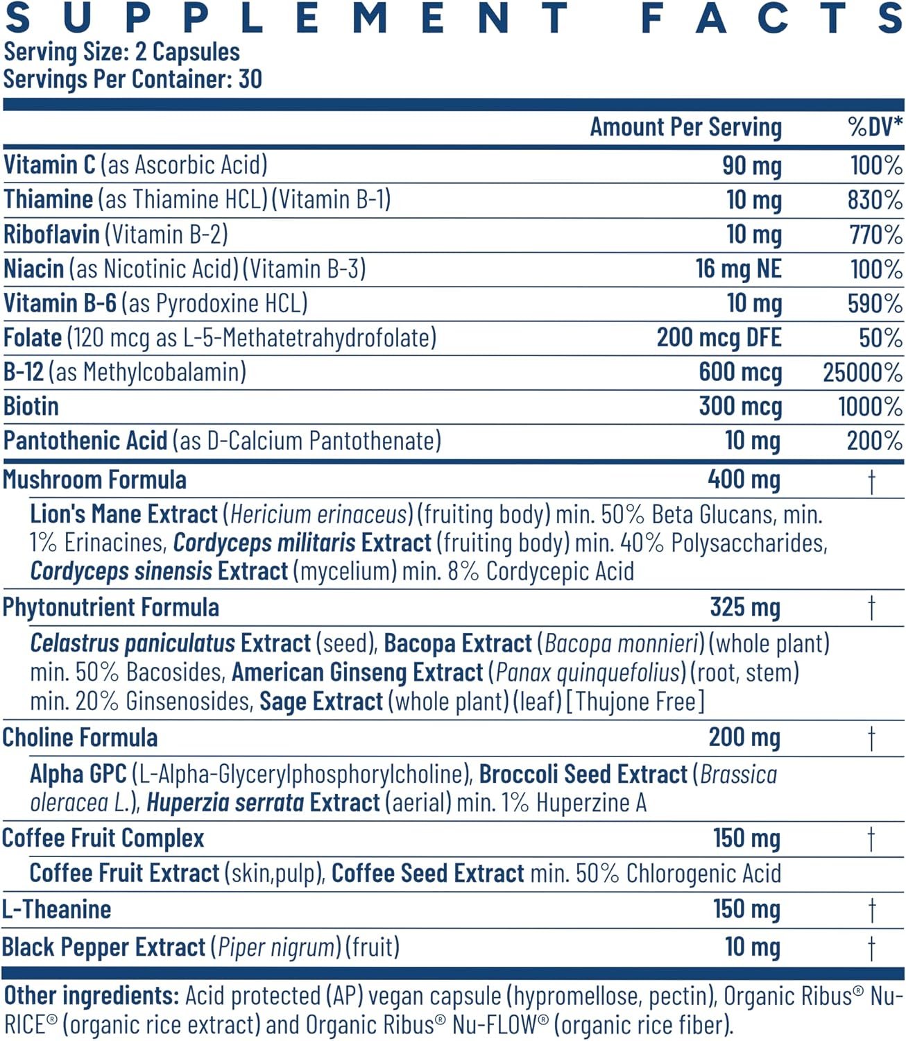 𝗙𝘂𝗲𝗹 𝗬𝗼𝘂𝗿 𝗘𝗻𝗲𝗿𝗴𝘆, 𝗙𝗹𝗼𝘄, & 𝗕𝗿𝗮𝗶𝗻 𝗗𝗿𝗶𝘃𝗲 : Fire up your engine with our highly bioactive methyl B complex. Alpha GPC Choline, B12, B6, & B9 play crucial roles in ATP energy production, mitochondrial, & neurological health. Outlast the competition with reduced caffeine Whole Coffee Berry for restorative support without the toxic crash. Get your flow state on with Dual Extracted Cordyceps Mushrooms and support maximum oxygen NO2 uptake, VO2 max factors, heart, lung, & cerebral blood flow.*
