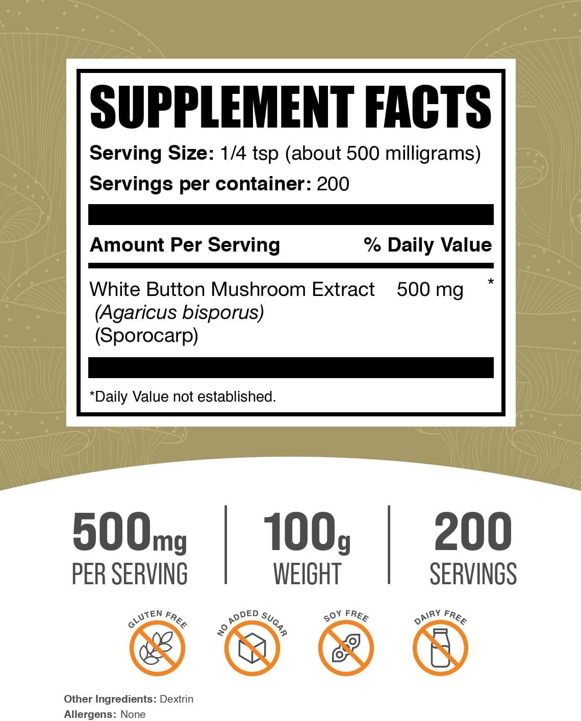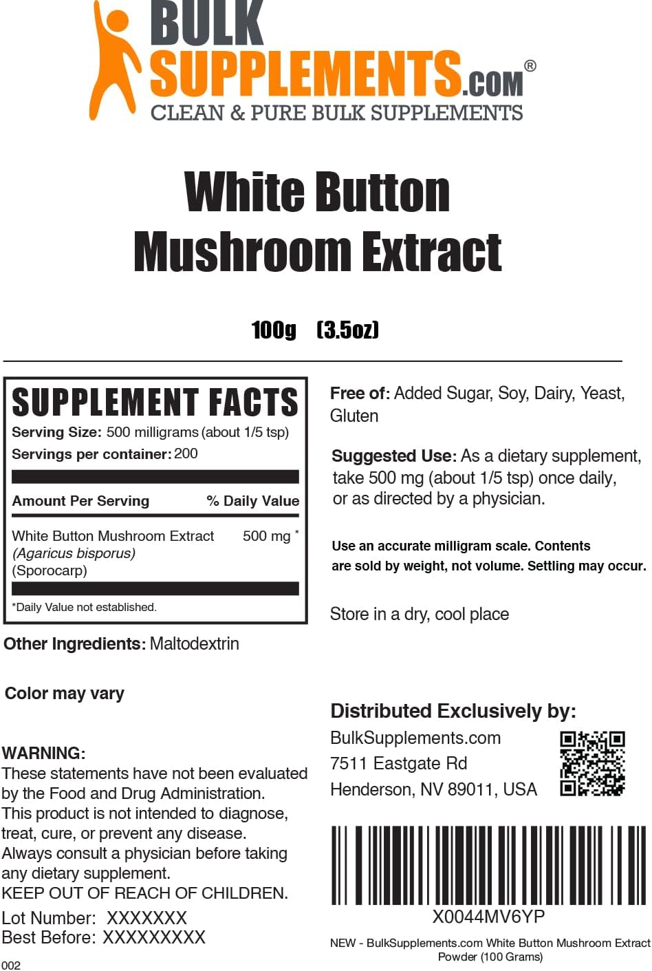 BulkSupplements.com White Button Mushroom Extract Powder – Mushroom Supplement, Agaricus Mushroom Powder – Gluten Free, 500mg per Serving, 100g (3.5 oz) (Pack of 1)