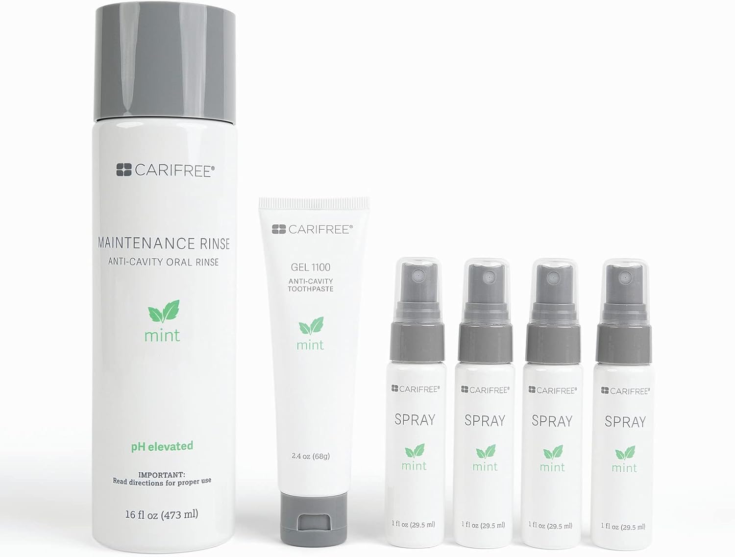 [WIN THE BATTLE]: Do you ever wonder why some of us continue to get cavities despite meticulous oral hygiene, whereas others who rarely brush and floss do not? The risk of cavities varies from person to person and is based on dietary habits, hygiene (brushing and flossing), saliva flow, as well as other factors. This CariFree kit contains a 1-month supply of our CariFree Gel 1100 and CaiFree Maintenance Rinse.