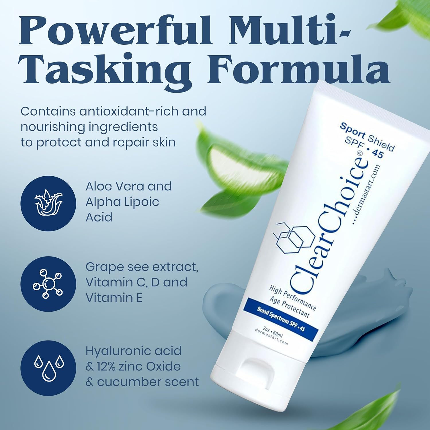 ClearChoice Sport Shield SPF 45 is a lightweight, non-comedogenic, travel-size sunscreen that provides broad-spectrum protection while nourishing your skin. Perfectly sized for on-the-go convenience, it fits effortlessly into your bag, making it ideal for travel, outdoor activities, and daily adventures. Infused with antioxidants and hydrating hyaluronic acid, it shields against harmful UVA/UVB rays and helps combat premature aging. Water- and sweat-resistant for up to 80 minutes, it’s perfect for daily use, even under makeup. Suitable for all skin types, including sensitive and acne-prone skin, this cruelty-free formula is made with responsibly sourced ingredients for a safe, effective, and portable skincare solution.