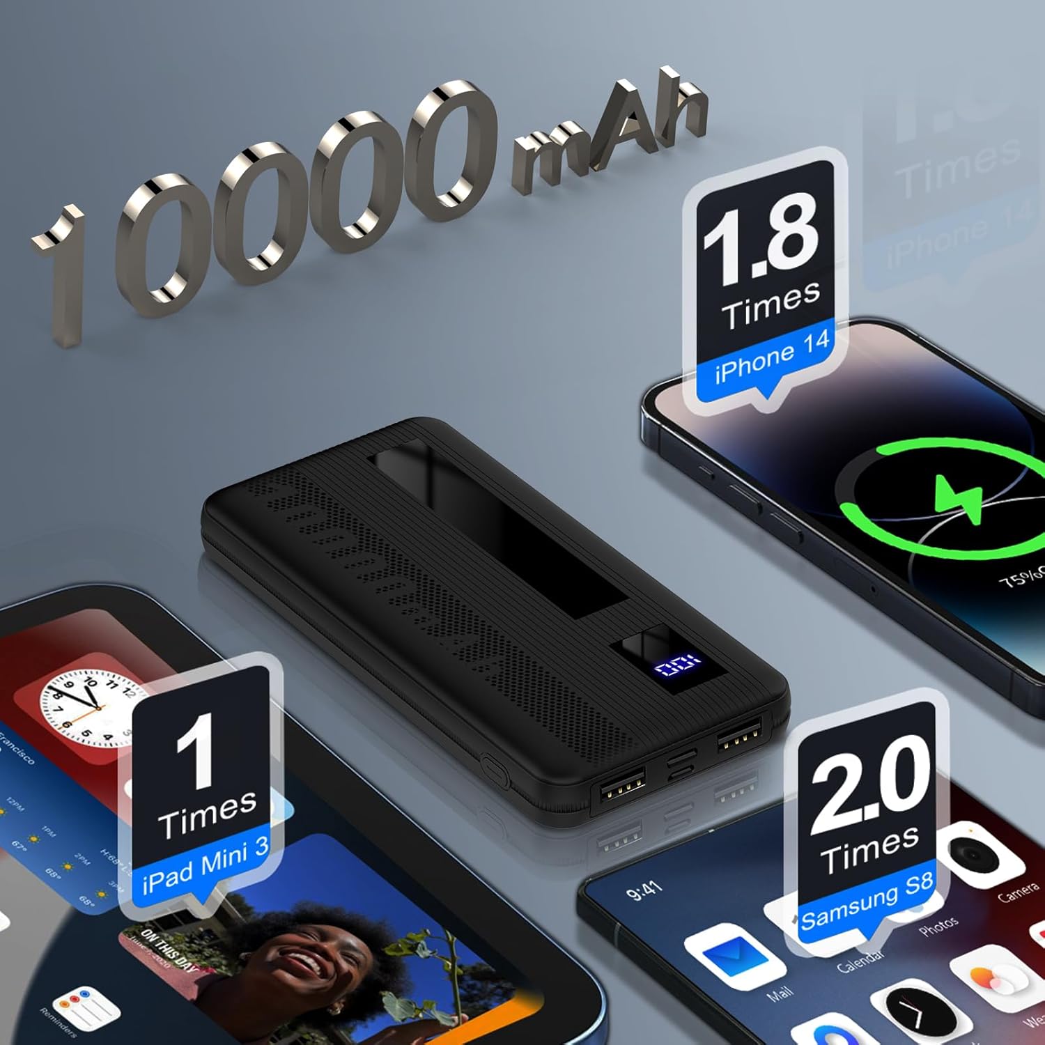 ULTRA-LONG STANDBY: With a total capacity of 10,000mAh, this charging bank can fully charge an iPhone 8-15 series 2-3 times, or a Samsung Galaxy series twice. The 10,000mAh portable power bank provides 3-5 days of battery life, so you can travel worry-free and avoid battery endurance anxiety.