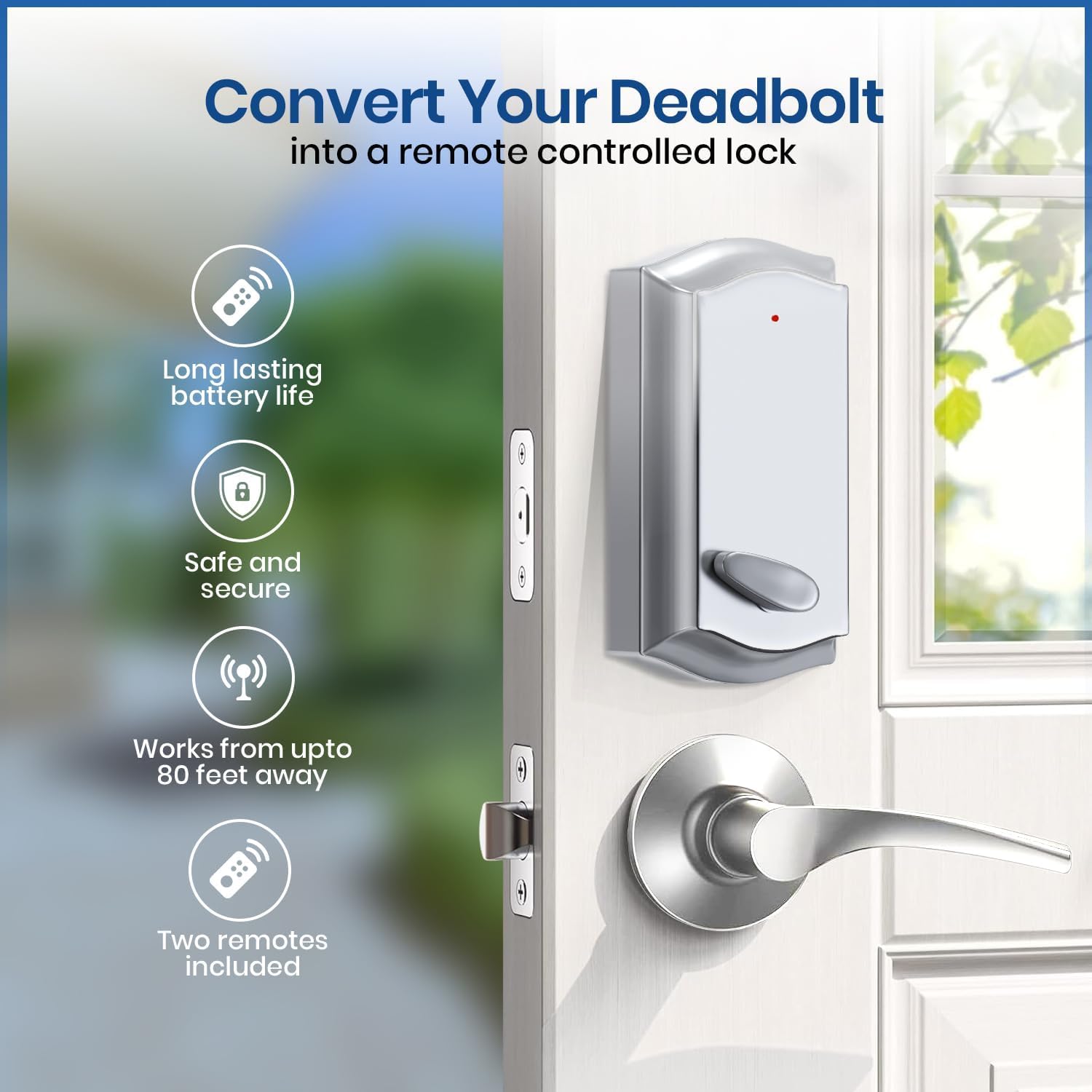 Deadbolt Smart Lock Conversion Kit – Remote-Controlled Keyless Entry Door Lock with Secure Rolling Code Technology, Easy Installation, 80 Ft Range, Includes 2 Key Fob Remotes (Brushed Silver)