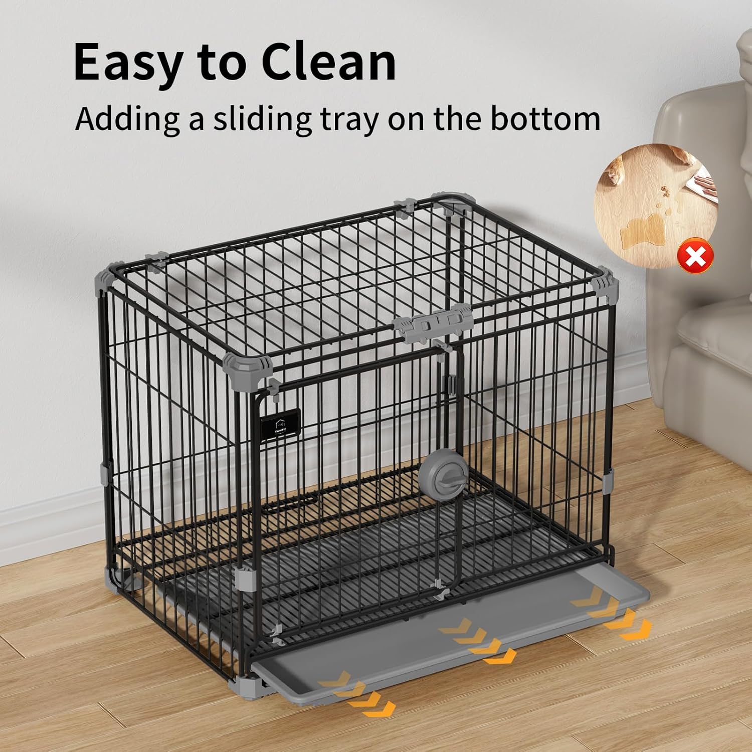 【Easy To Clean Slide Out Tray】: Our puppy crate has a convenient drawer waste tray at the bottom of the crate that effectively separates your pet from feces. You can easily remove the tray without disturbing your pet for quick and easy cleaning. This small dog crate provides a clean and comfortable environment for your furry friend