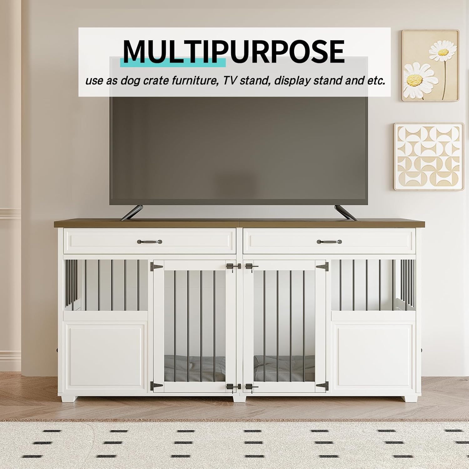 Dog Crate Furniture – Indoor Wood Dog Kennel Furniture 4 Doors with Divider and 2 Drawers – 72″ L x 23.6″ W x 34.8″ H, White