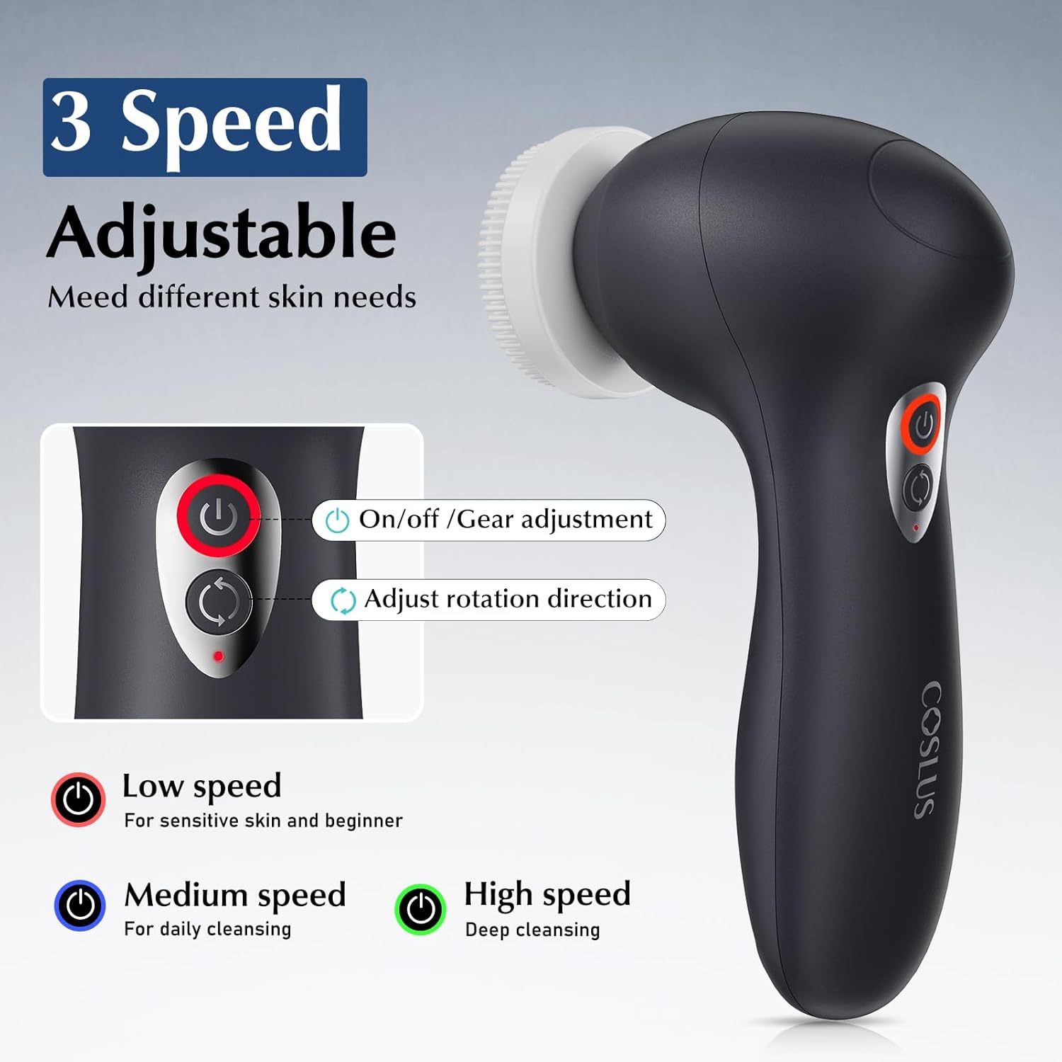 3 Speed Adjustable & Easy To Use: The COSLUS rechargeable facial brush provides 3 personalized speed modes to meet different cleansing needs: low-speed gentle exfoliating; medium-speed daily cleansing; high-speed deep cleansing pores and exfoliates dead skin. With its ergonomic handle design, it fits comfortably in your palm and reduces hand fatigue, allowing you to achieve the best cleaning results in the most comfortable way possible. It is twice as effective as other single-direction brushes
