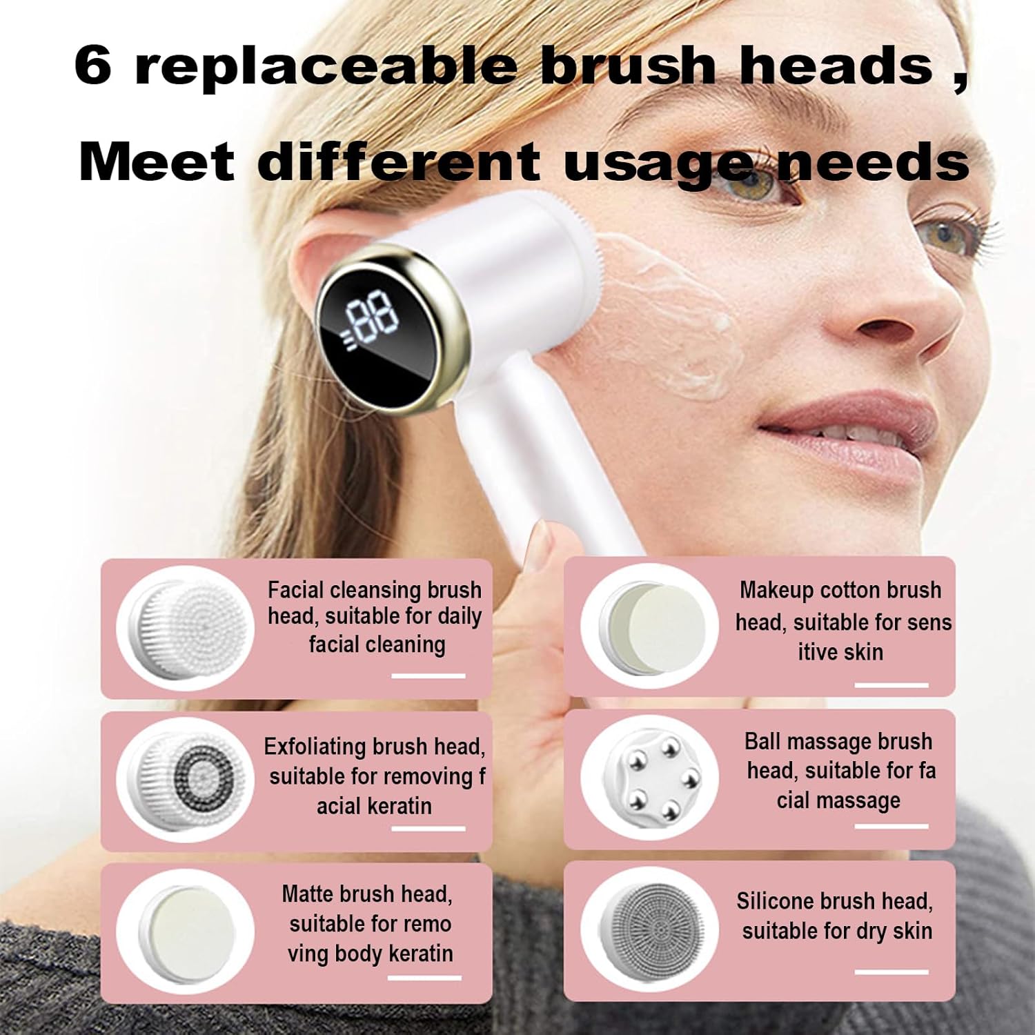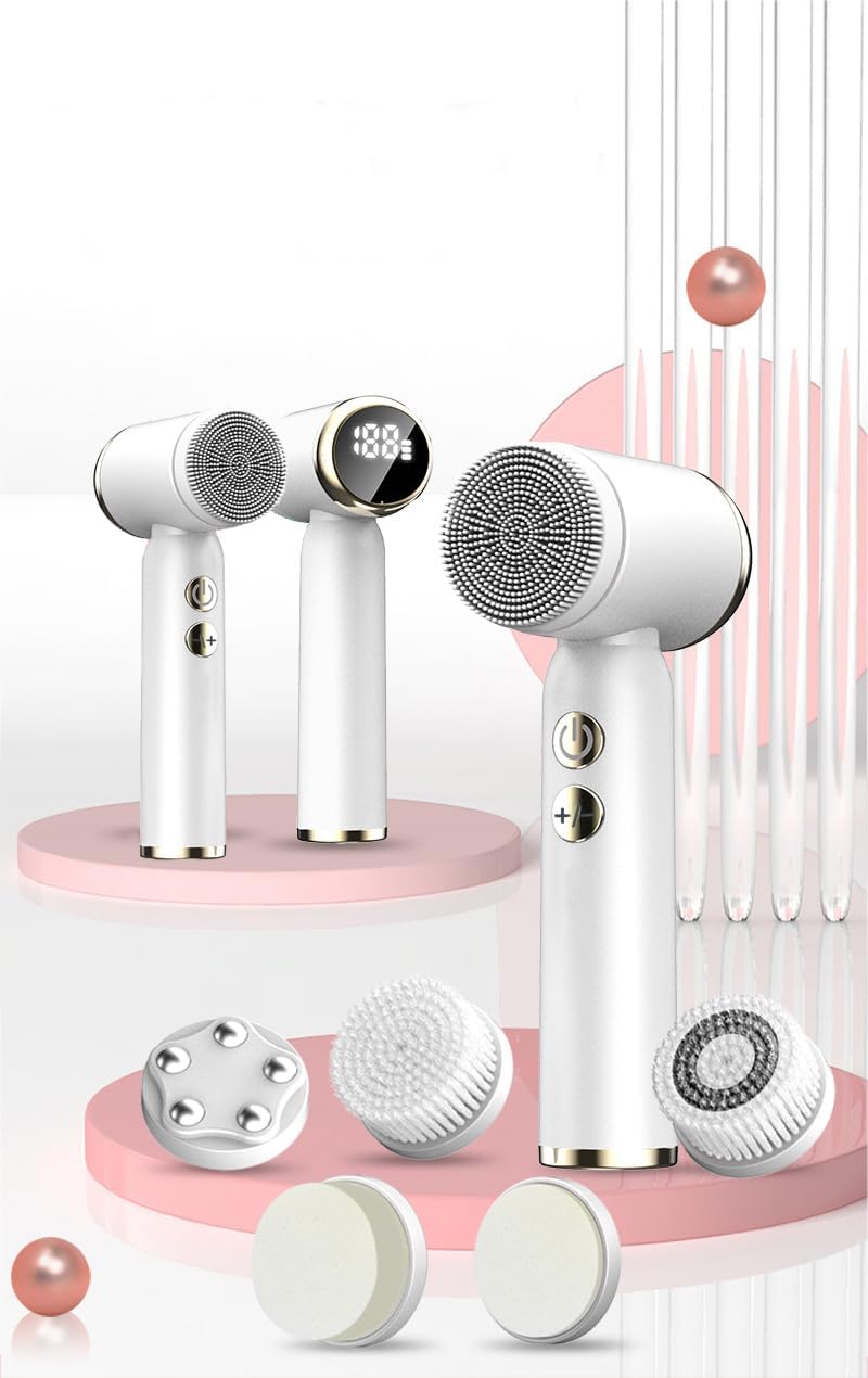 【6 in 1 Interchangeable Brush Head】Our facial brush is equipped with 6 different replaceable brush heads, suitable for different skin types and skin problems. One soft bristled brush head is suitable for daily facial cleaning, one deep cleansing brush head is suitable for deep facial cleaning, one silicone brush head is suitable for dry skin, one makeup cotton brush head is suitable for sensitive skin or makeup remove, one exfoliating brush head is suitable for removing body keratin, and one massage ball brush head is suitable for facial massage.