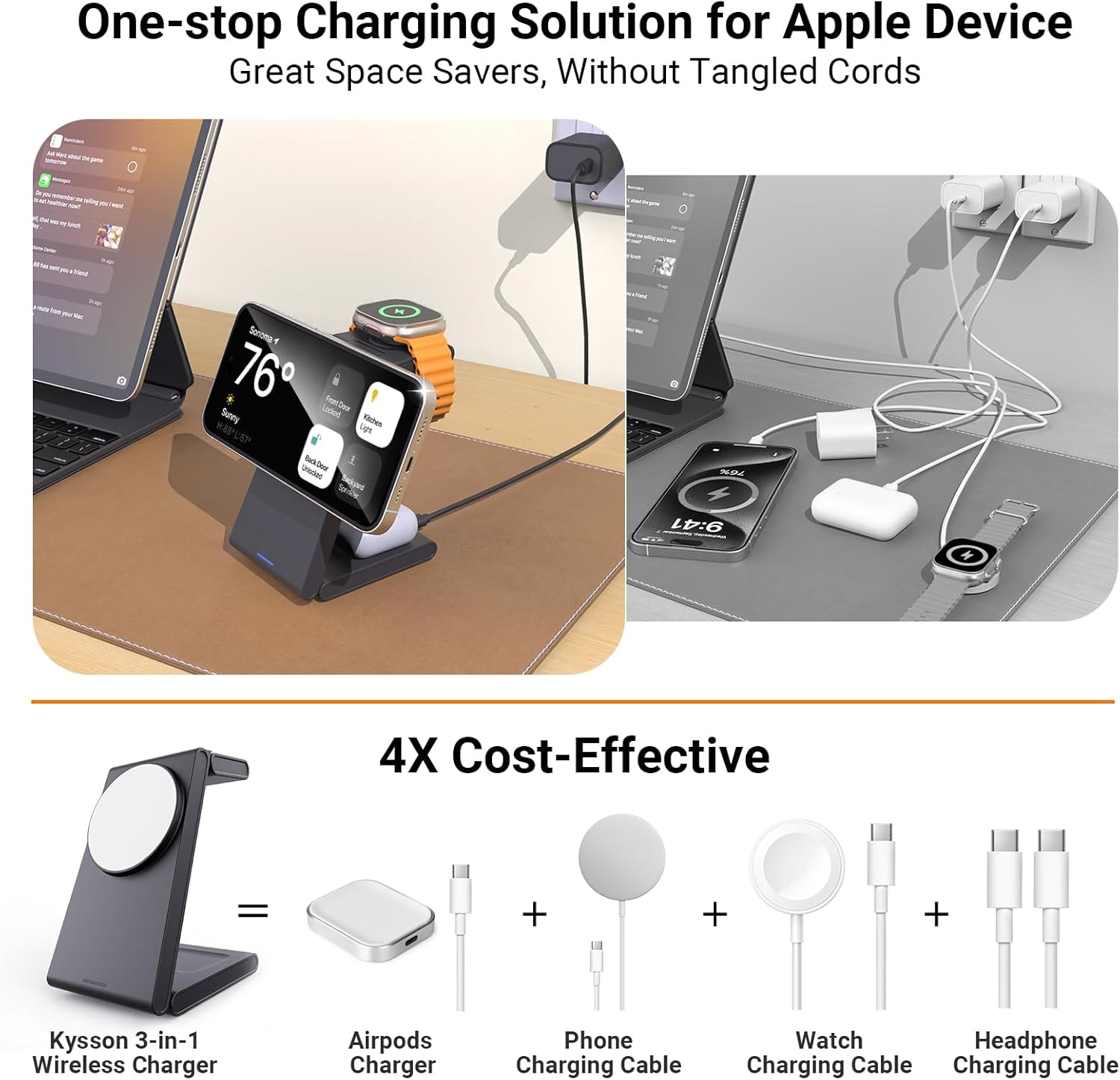 💕【Inclueded 20W adapter, Excellent Customer Service】①Kysson magnetic 3 in 1 wireless charging station with MagSafe ②20W adapter(UL) ③3.3ft / 1m type c cable④a set magnetic ring⑤12-month ⑥lifetime customer service. Elevate your charging experience with Kysson iPhone charging station-it’s more than just a wireless charger stand, it’s a commitment to quality and service! If you have any questions, please let us know and we will reply within 12 hours
