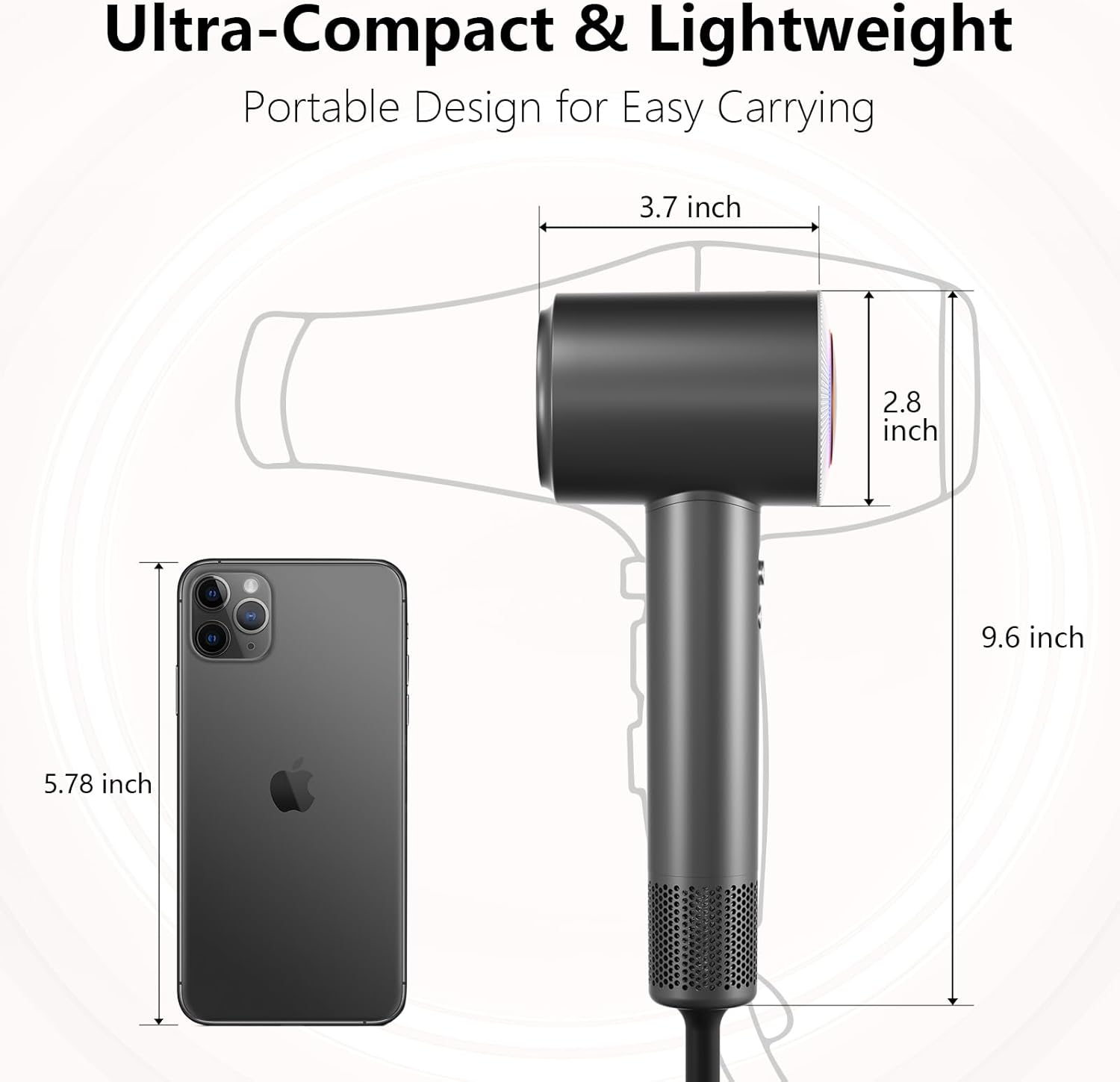 【Lightweight & Quiet】Designed for ergonomic comfort, this hair dryer weighs a mere 0.89 lb, lighter than a cup of coffee. Its lightweight design minimizes arm fatigue, ensuring a relaxed and comfortable experience even during extended use. Equipped with 8-layer damping and noise reduction technology, along with high sound insulation and German PI sound-absorbing material, it maintains noise levels under 51 dB. You can use it anytime without worrying about disturbing others.
