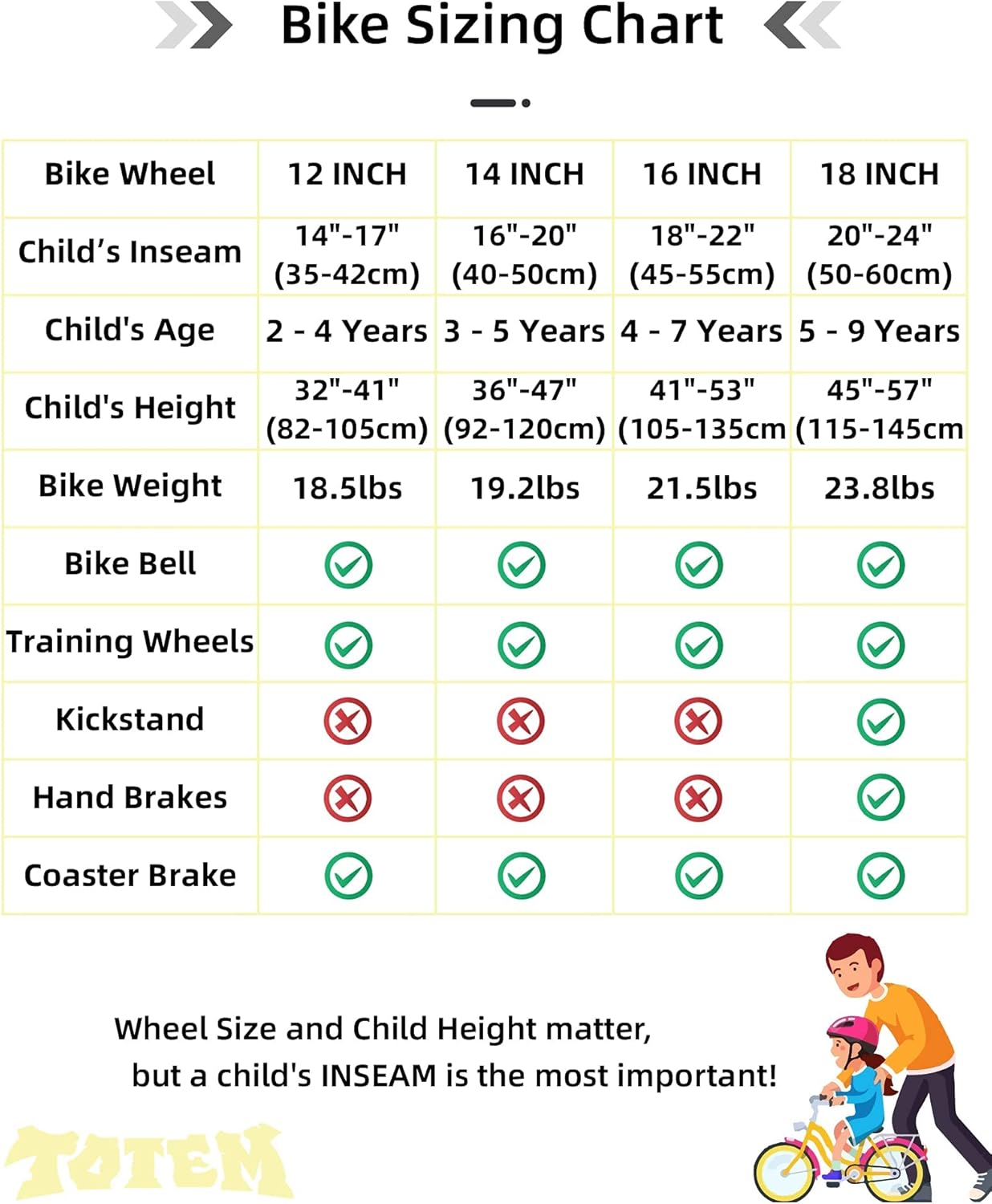 RECOMMENDED SIZE CHART – 12″ BIKE FOR 2-4 YEARS (33″-41″) TODDLER, 14″ bike for 3-5 years (35″ – 47″) child, 16″ bike for 4-7 years (41″ – 53″) boys & girls, 18″ bike for 5-9 years (43″-59″) boys & girls. Note: child height may vary even at the same age, please take the height into consideration.