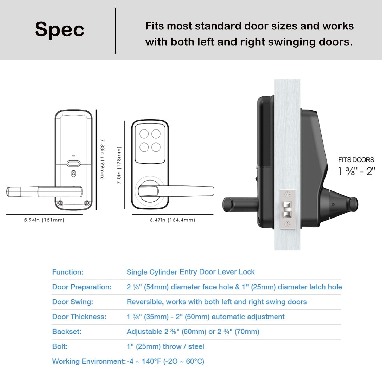 Easy DIY Installation: Installs in no time with common household tools; Rekeying Capability: Replace the key cylinder without changing the lock (with standard rekey kit); Warranty: Limited 5-year mechanical and finish warranty and 2-year electronics warranty, plus lifetime technical support.