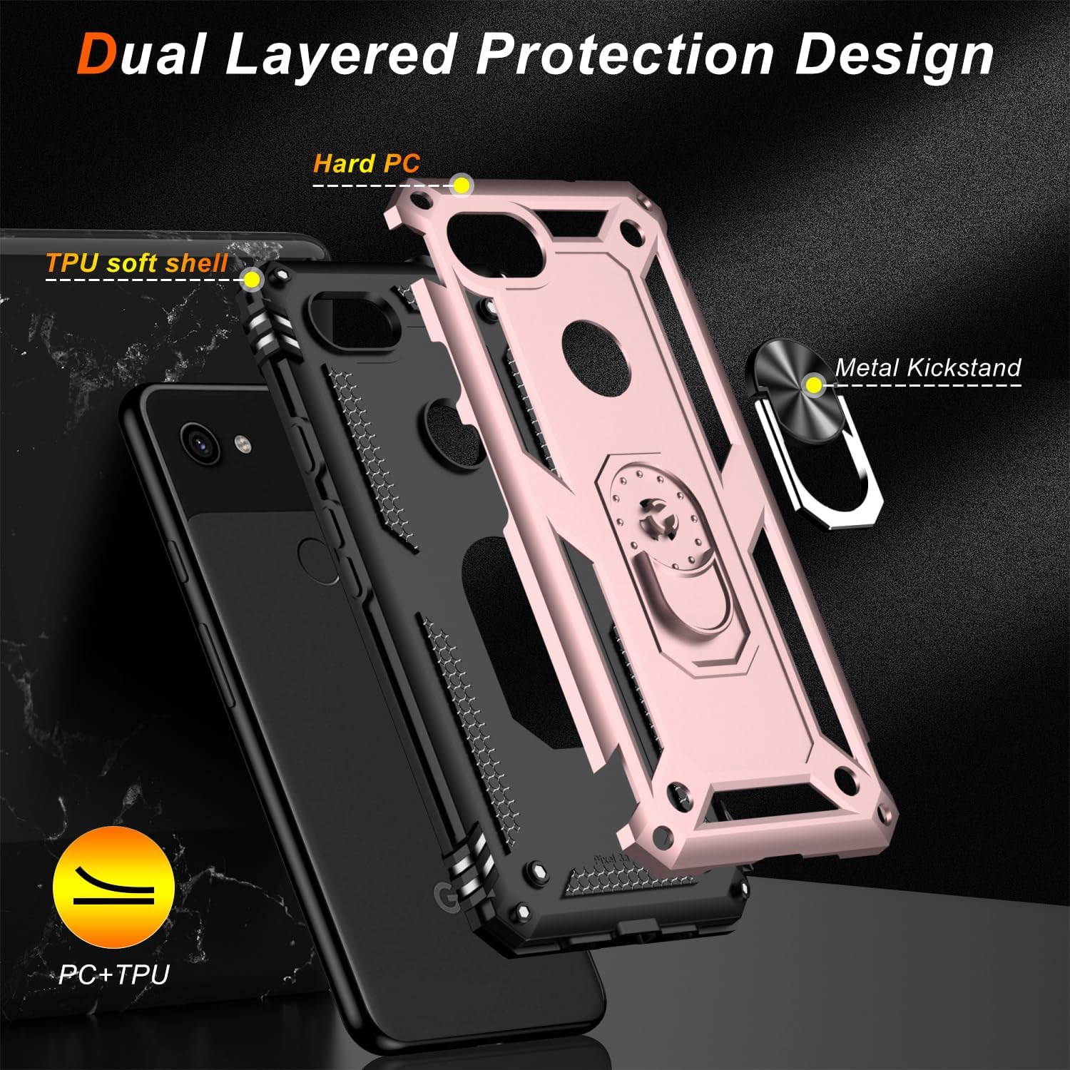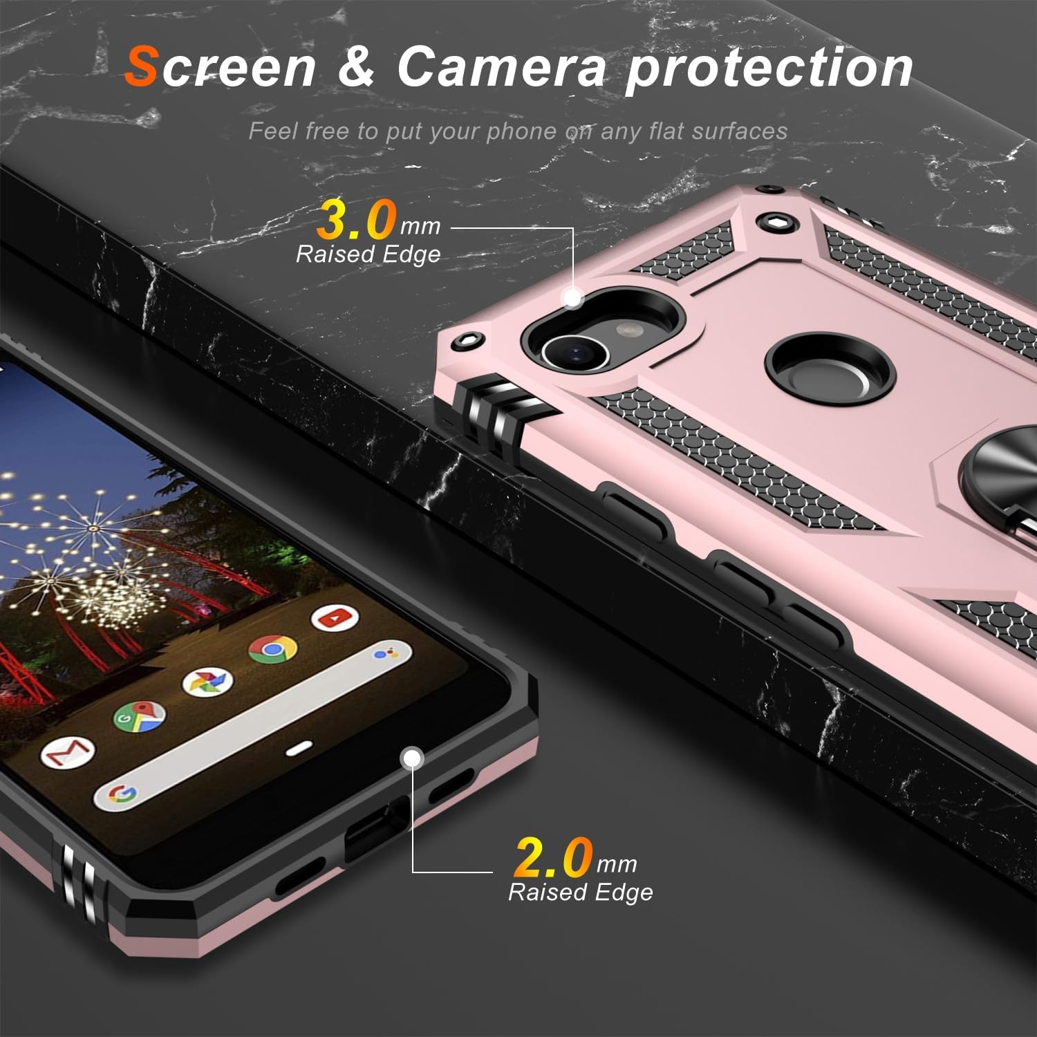 LUMARKE for Google Pixel 3A XL Case with Screen Protector,Pass 16ft. Drop Tested Military Grade Protective Phone Cover with Magnetic Ring Kickstand Compatible with Car Mount Holder Rose Gold