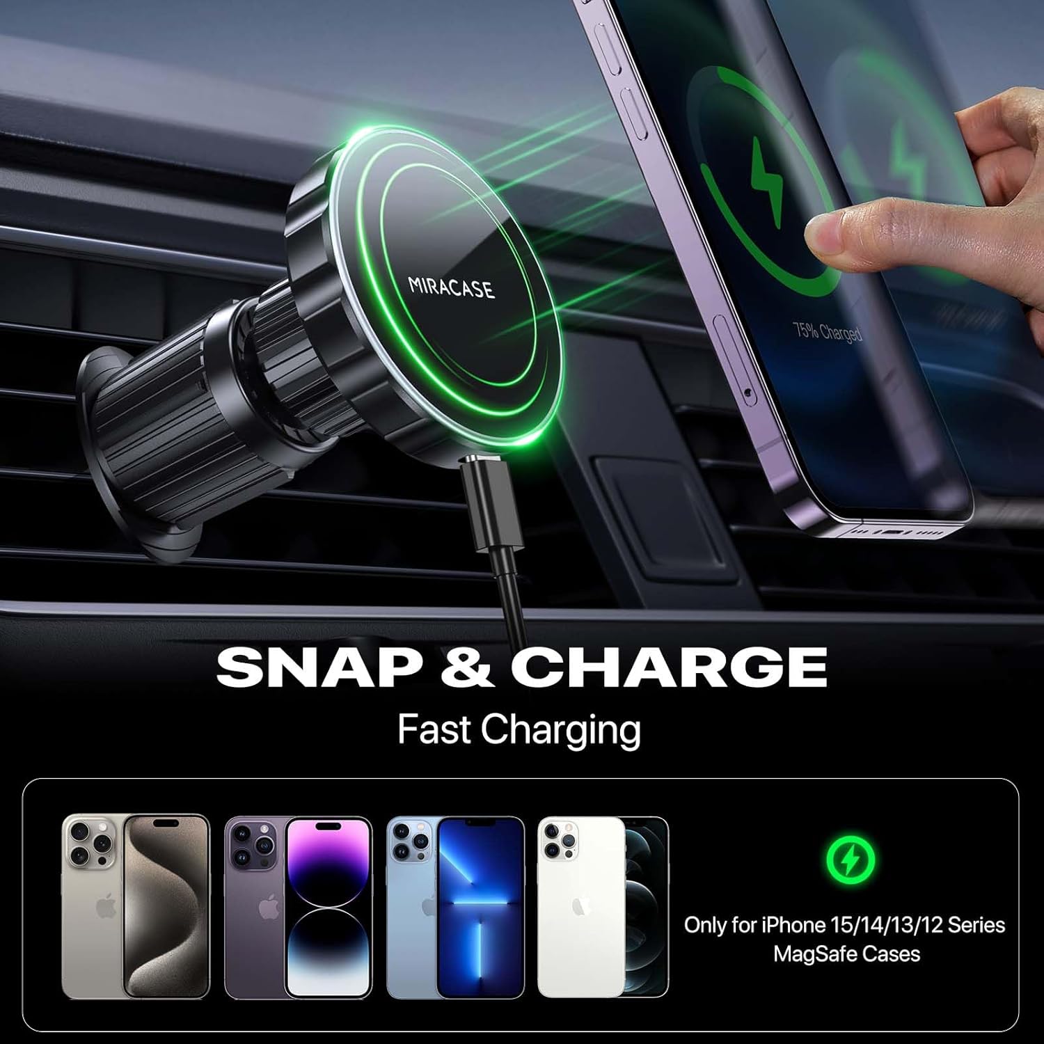 Miracase for Magsafe Car Mount Charger, 15W Fast Charging Magnetic Wireless Car Charger Compatible with Magsafe, Air Vent Car Phone Holder Charger Only Fit iPhone 16/15/14/13/12 Series
