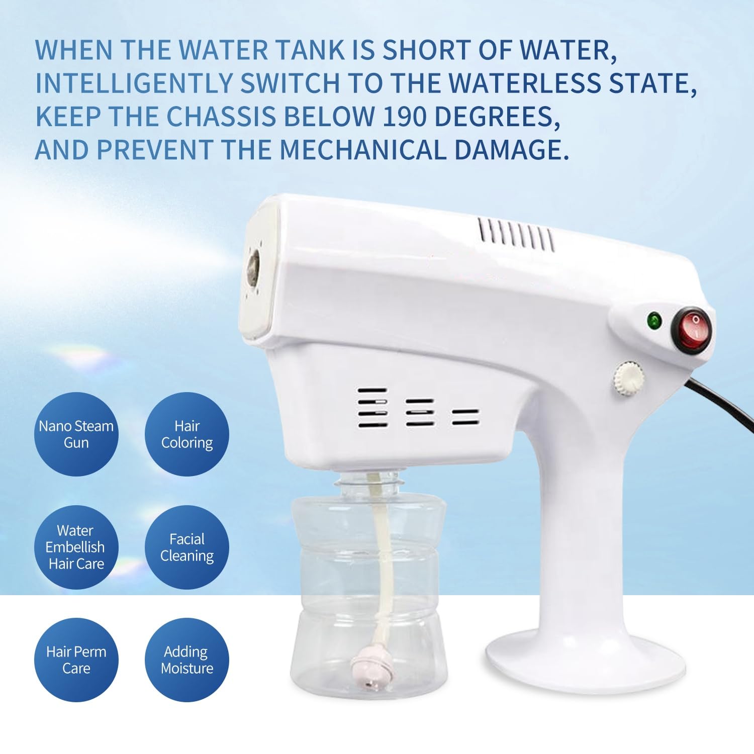 High Quality Nano Sprayer: High quality nano spray orifice, with PA material resistant to high temperatures, rapid misting, nano spray lot mist 0.226 nm, unique negative ion blue light.