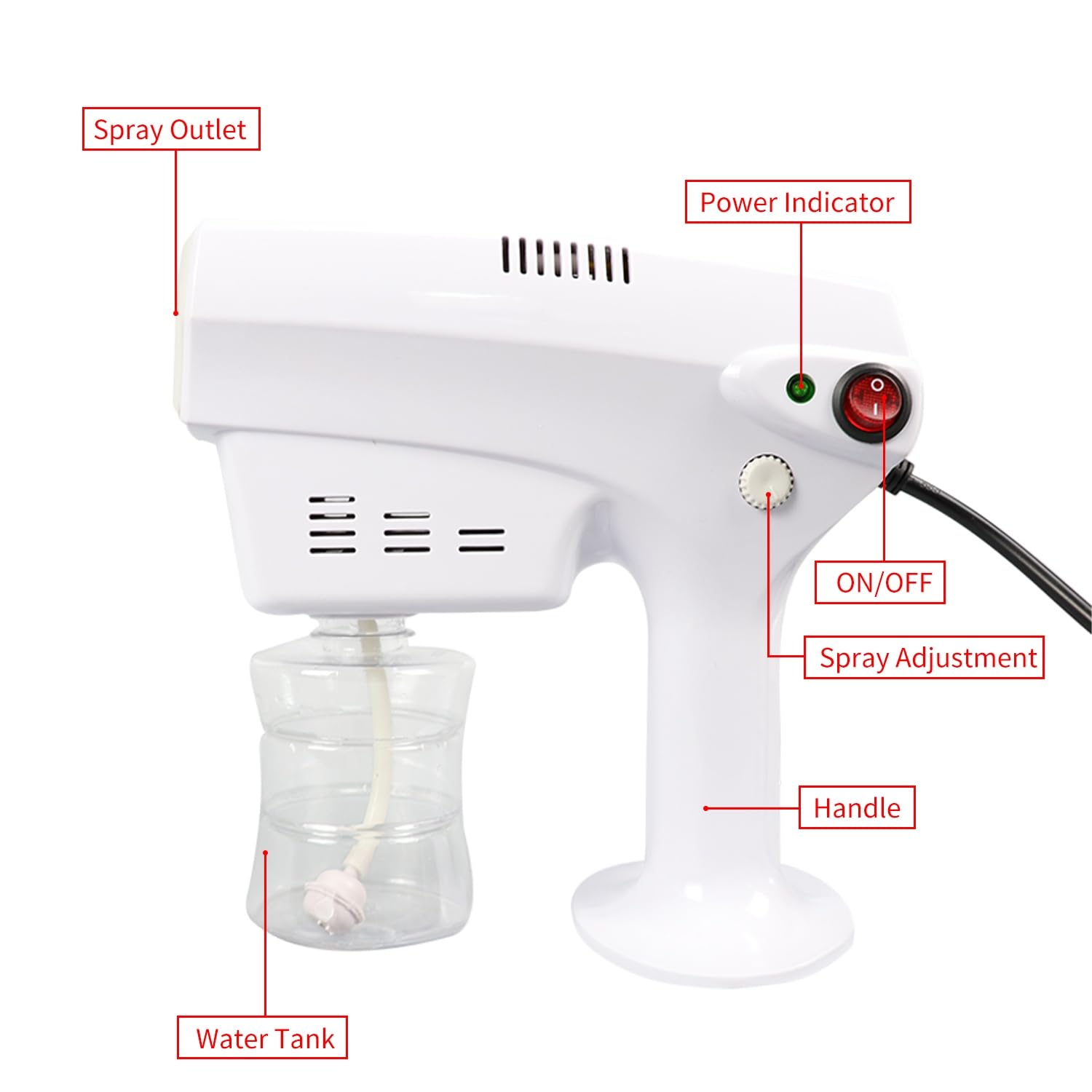 This nano fogger can adjust the amount of spray by turning the switch on the handle. It can reach a spray distance up to 2 meters(6.5ft), allows you to easily control the intensity, and eliminate unclean substance in all areas!