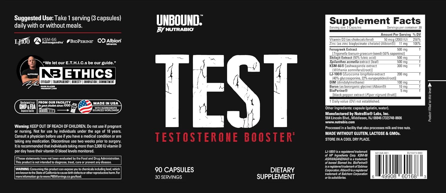 NutraBio Unbound Test, Testosterone Supplement for Men, Testosterone Booster, Libido, Boron, Fenugreek, Tongkat Ali, 90 Capsules