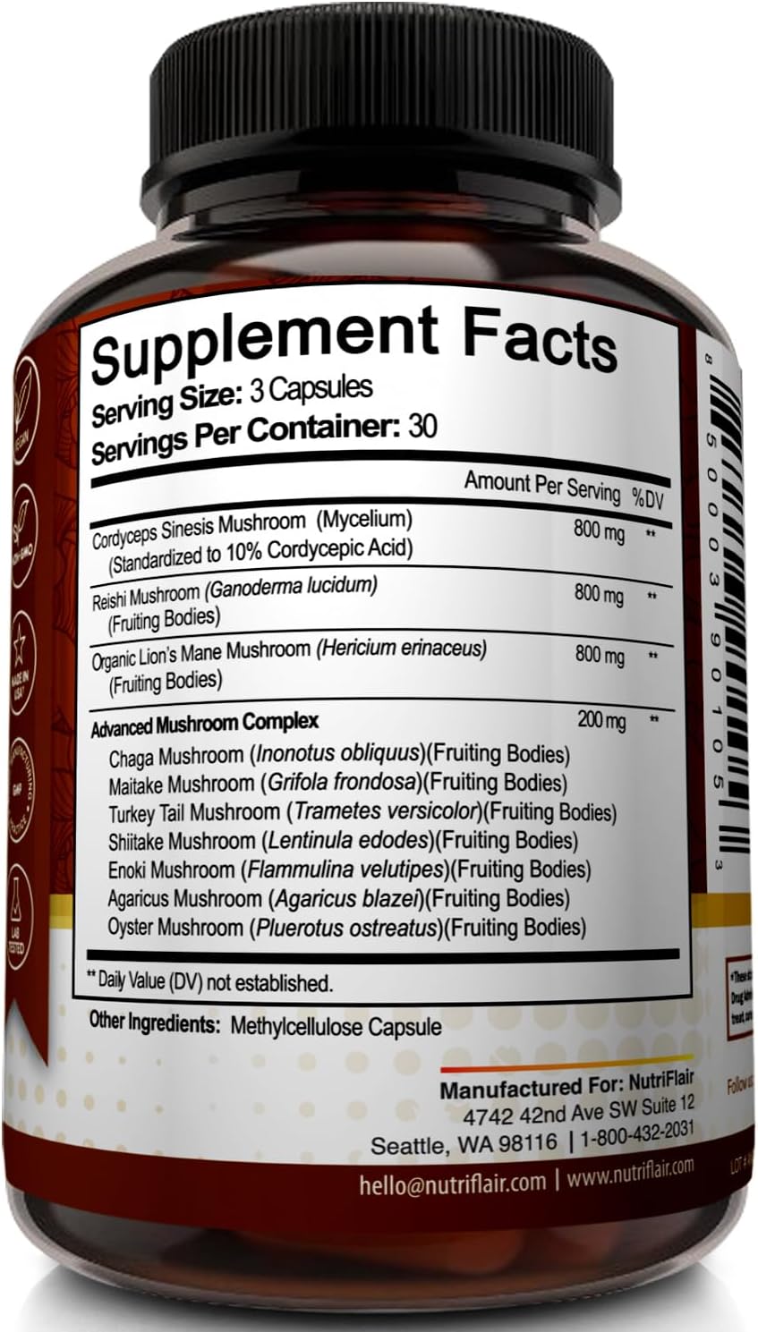 NutriFlair Mushroom Supplement 2600mg, 90 Capsules – 10 Mushrooms Blend – Reishi, Lions Mane, Cordyceps, Chaga, Turkey Tail, Maitake, Shiitake, Oyster Nootropic Complex – Brain, Energy, Focus Pills