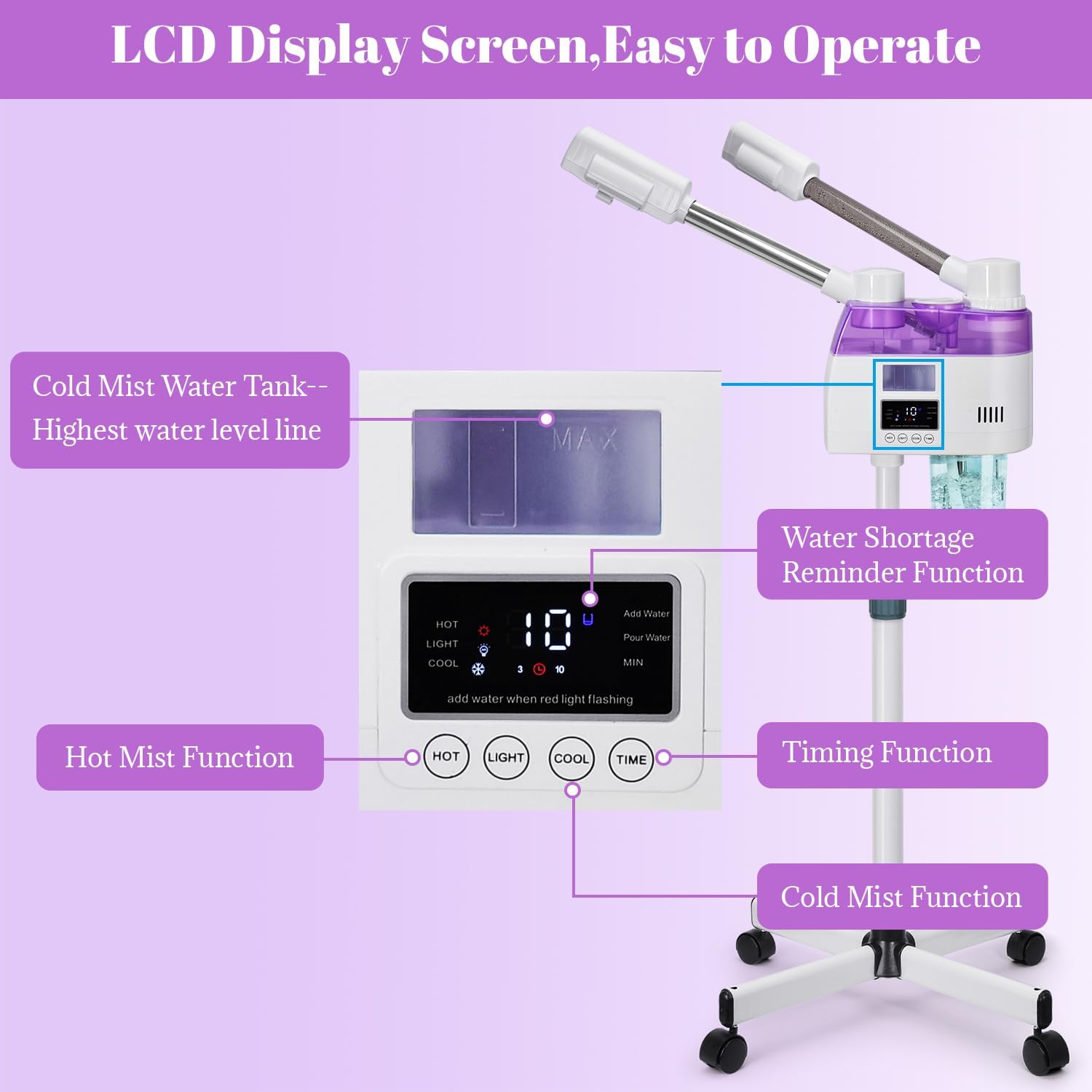Easy to Install and Use—-Face steam machine with 4-leg wheeled stable stand base that allows you to move around in the salon freely.