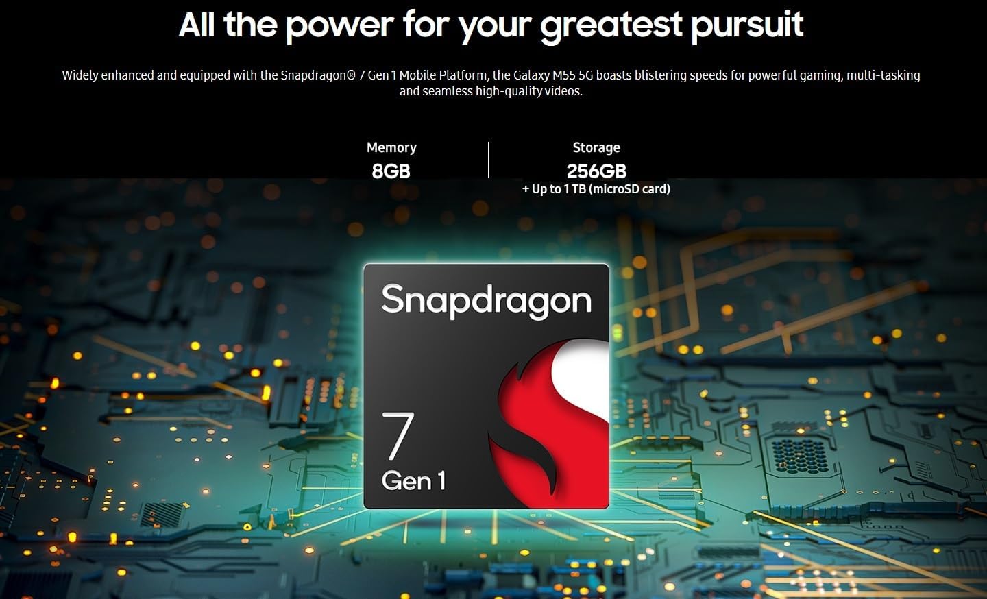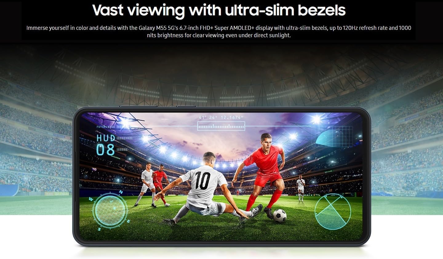 The Samsung Galaxy M55 5G Dual SIM is your gateway to cutting-edge mobile technology. Its 6.7-inch FHD+ Super AMOLED display with a smooth 120Hz refresh rate ensures vibrant visuals and responsive touch, perfect for streaming, gaming, and browsing. Powered by the advanced Snapdragon 7 Gen 1 (4nm) chipset and Android 14, this device delivers exceptional performance for multitasking and demanding apps. Equipped with a powerful 50MP triple-camera system, the Galaxy M55 captures sharp photos, immersive ultrawide shots, and detailed macro images. Record stunning 4K videos and take perfect selfies with the 50MP front camera. Stay connected longer with the robust 5000mAh battery, and enjoy the convenience of dual SIM support for seamless global connectivity. Additional highlights include a sleek under-display fingerprint sensor, Bluetooth 5.2, and enhanced VoLTE support for crystal-clear calls. The Galaxy M55 5G combines innovation, power, and style in one sophisticated package.