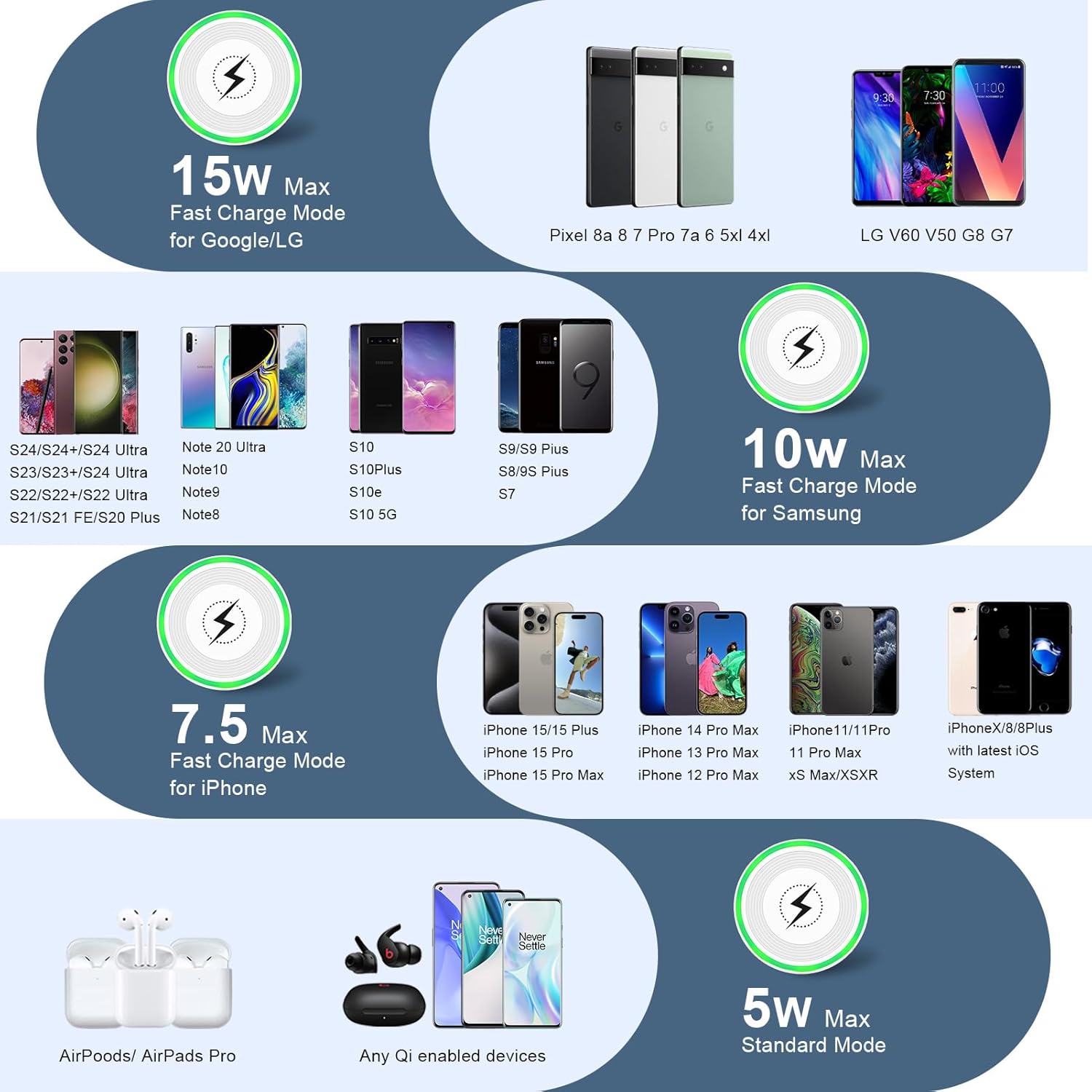 【Widely Charging Model】:Fast wireless charger pad for Motorola Edge 2024/G Stylus/G Power 5G (2024)/X50 Ultra/X40/X30/Pro/Edge 30 Ultra/Razr, 10W wireless charger fast charging for Samsung Galaxy S24/S23 Ultra/S22 Ultra/S22/S21 S20 FE/S21 S20 Ultra,Z Flip 6/5/4/3,Z Fold 6/5/4/3,S10E/S10/S9/S8,Note 20 Ultra/10/9. 7.5W iPhone wireless charging station for iPhone 15 Pro Max/15 Plus/14/14 Plus/14 Pro Max/13/13 mini/13 Pro/13 Pro Max/12/12 Pro/12 Pro Max/11/11 Pro Max/XS/XR/8 Plus.Google Pixel 9/9 Pro/9 Pro XL/8a/8 Pro/7a/7 Pro/6 Pro/6/5/5XL/4/4XL,5W for any Qi enabled devices.Max output 15W