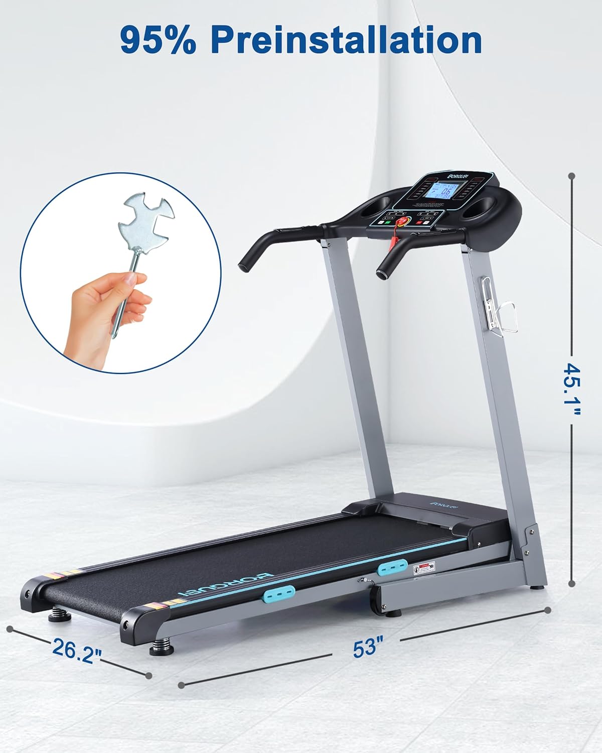 【Widened Double Shock-Absorbing Deck】BORGUSI 43.5″ x 17.5″ large running track to fit different users‘ stride lengths. The stability of the double deck running surface benefits from the integrated shock absorption system, the double deck technology cushions your footfalls with each step. BORGUSI treadmill is designed to accommodate users of most body types with a weight capacity of 300 lbs.