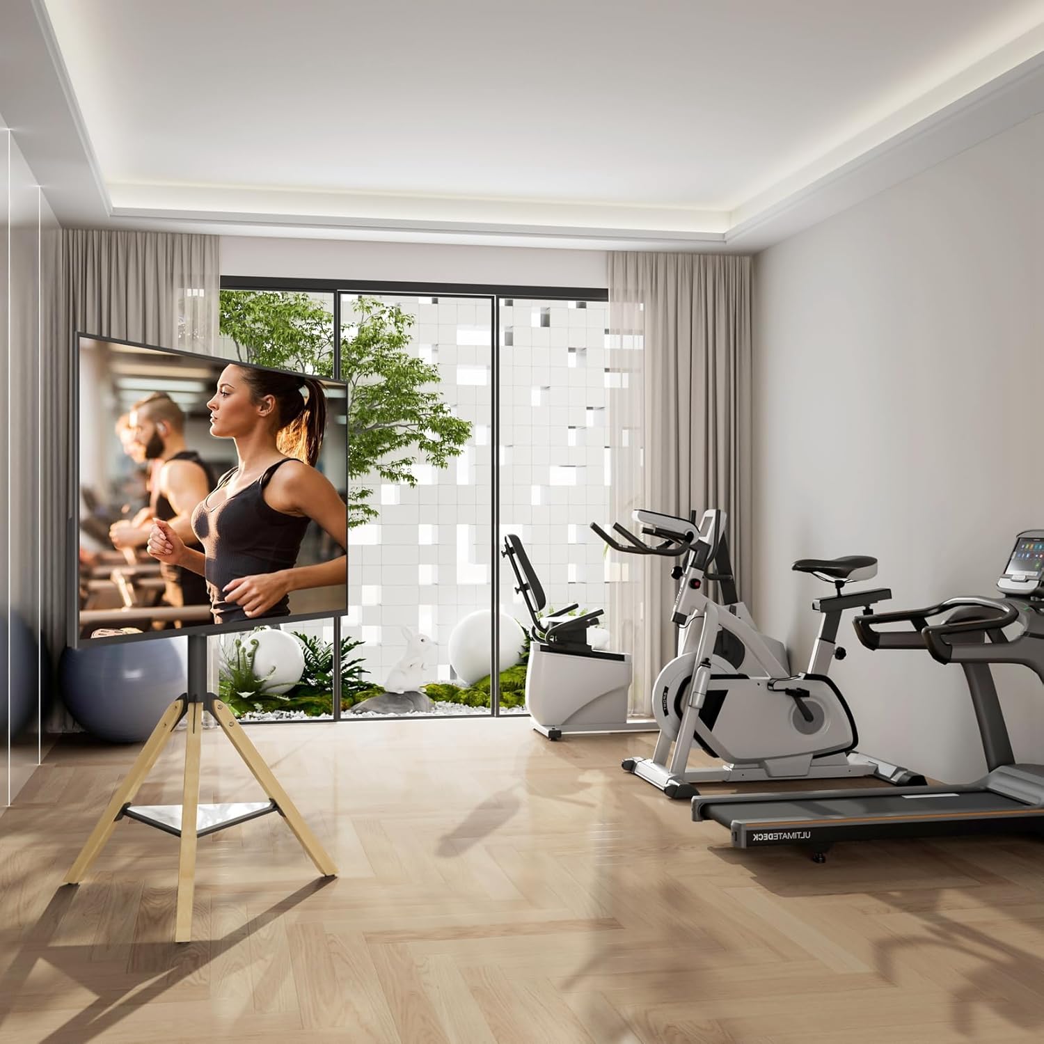 This TV floor stand is a versatile and stylish piece of furniture designed to elevate your television viewing experience. Crafted with a combination of sturdy wooden and steel frame, adding a touch of natural warmth and enhanced durability. The built-in height adjustment and swivel function allow for optimal viewing angles. It features a tripod base that provides stability, ensuring that your TV remains firmly in place.