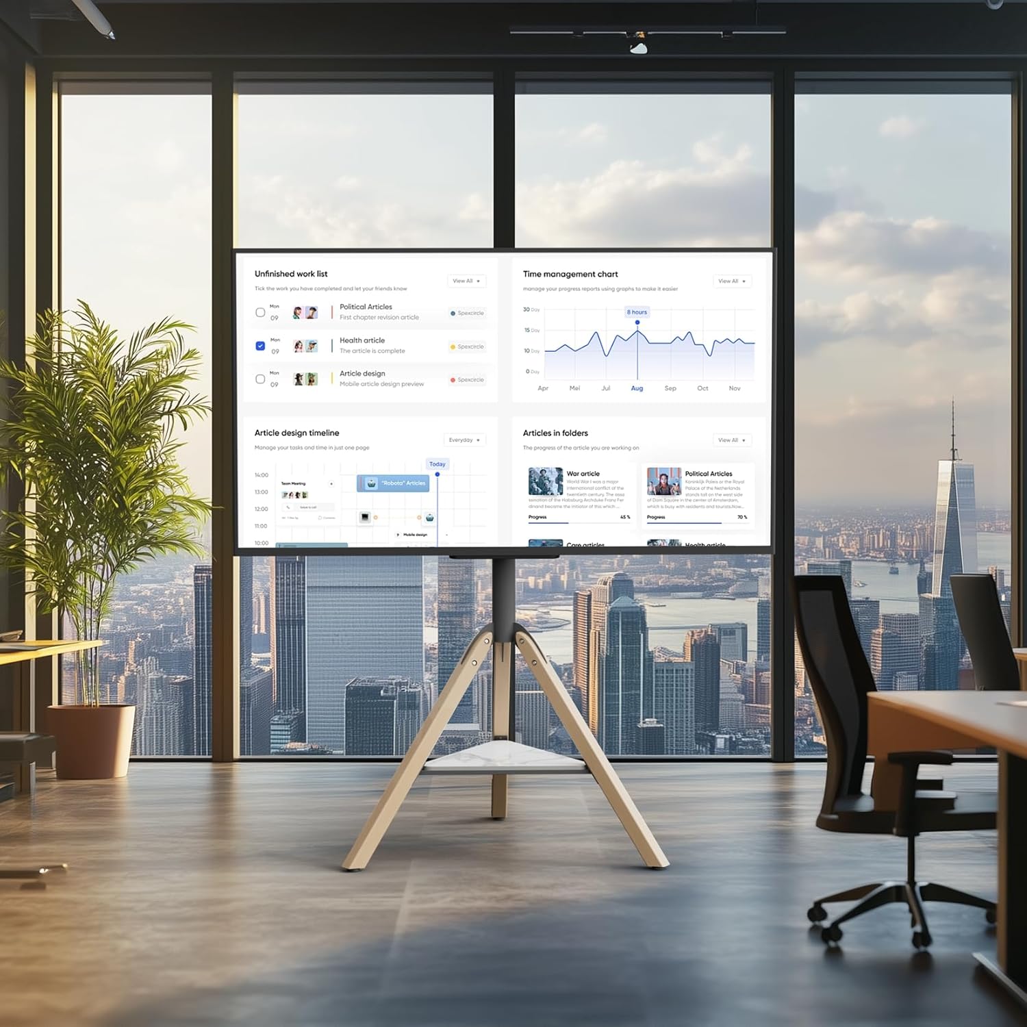 This TV floor stand features a mid-century sleek design with a robust metal frame and stylish wooden base. Suitable for 40 to 75-inch TV screens weighing up to 40kg. The tripod base provides stability and balance, while the height-adjustment and swivel left &right function allows users to adjust to their viewing angles. Perfect for living room, bedroom, office setting, the stand is both functional and aesthetically pleasing.