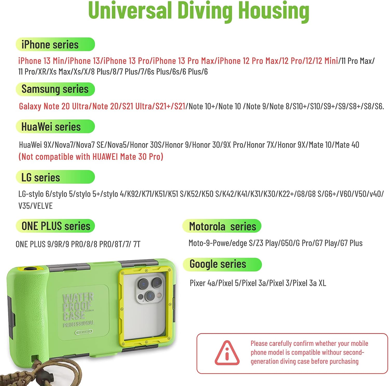 (Newest IP68 Professional Diving Case)The second-generation diving case is not only compatible with the Huawei, OnePlus, LG, Motorola and Google brand smartphones described in the main picture, but also compatible with the mobile phone models described in the first-generation diving case and the latest Apple and Samsung mobile phone models on the market (iPhone 12 Pro/12 Pro Max/13 Mini/13/13 Pro/13 Pro Max, Samsung Galaxy Note20 / Note20 Ultra/Galaxy S21/S21 +/S21 Ultra).