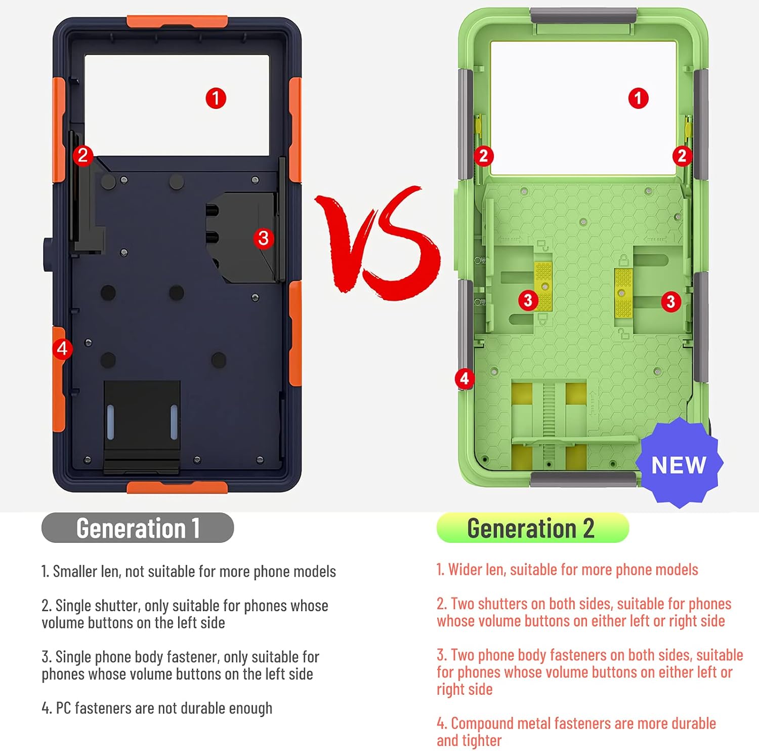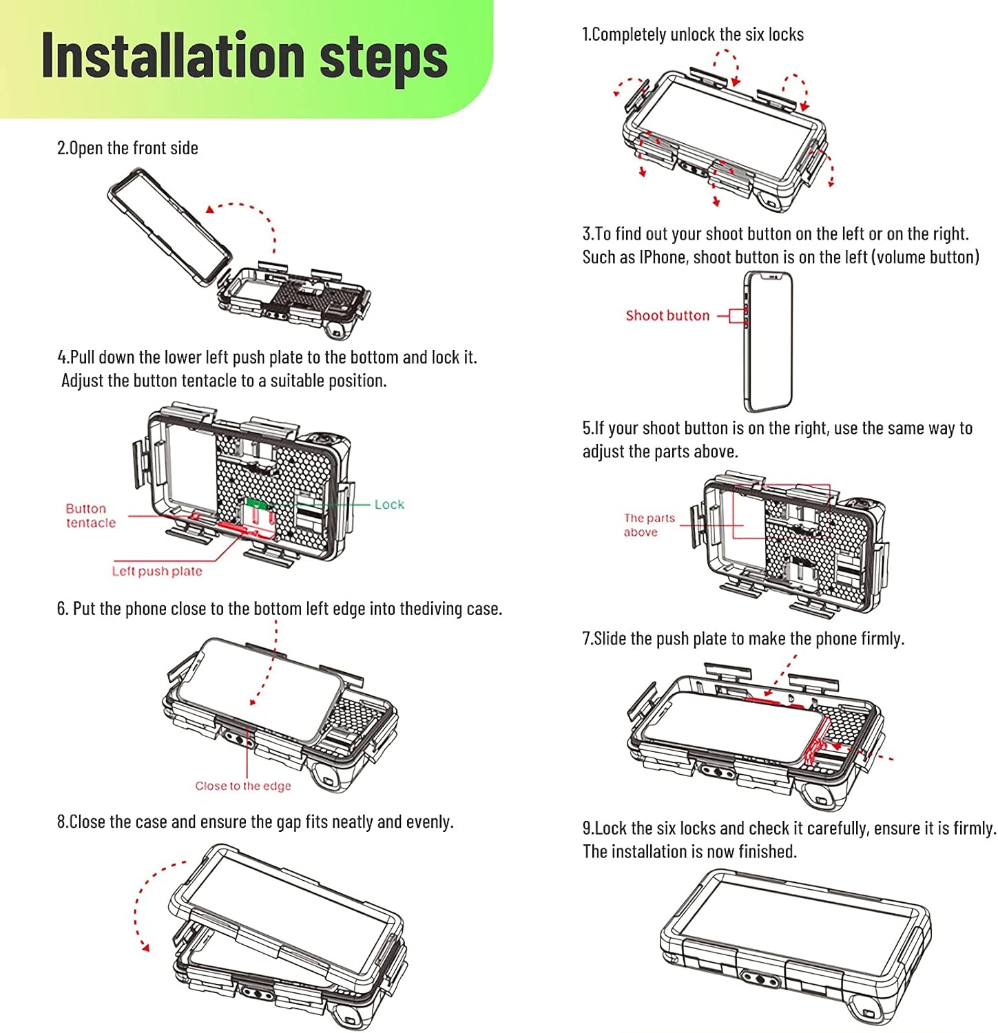 (Upgraded Compund Metal Fasteners and Snap)The second-generation diving case uses composite metal fasteners and folding snap , which are more durable and tighter. Two shutters and two phone body fastenes on both sides, suitable for phones whose volume buttons on either left or right side. Easy control to take beautiful images when underwater. It also has a phonograph tripod steady point, you can also install it on professional photography equipment like monopod, tripod or stabilizer.