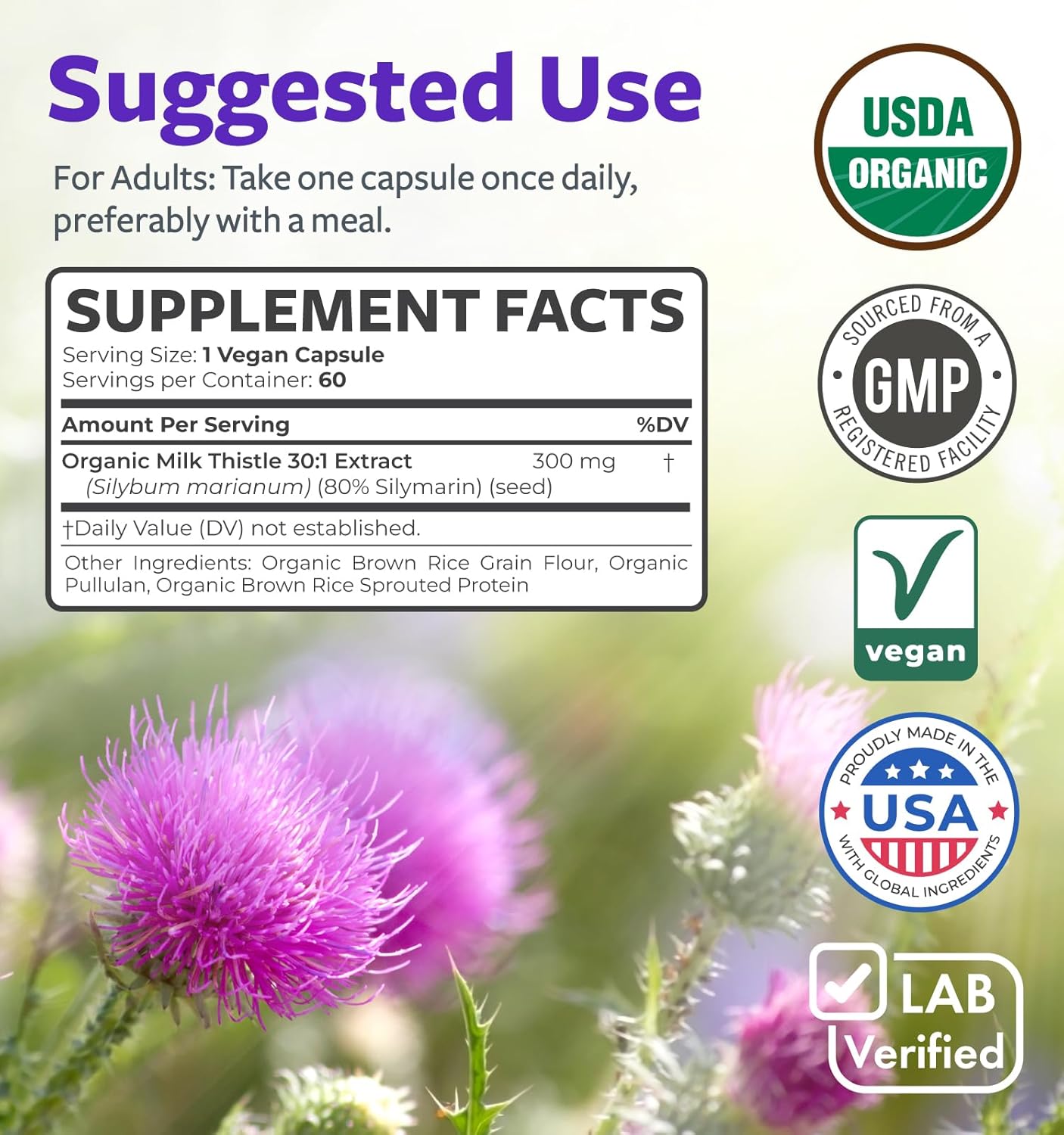 USDA Organic Milk Thistle Capsules – 80% Silymarin Supplement for Liver Support- Super Concentrated 300mg of 30:1 Milk Thistle Extract Equivalent to 9,000mg – Milk Thistle Liver Detox 60 Day Supply