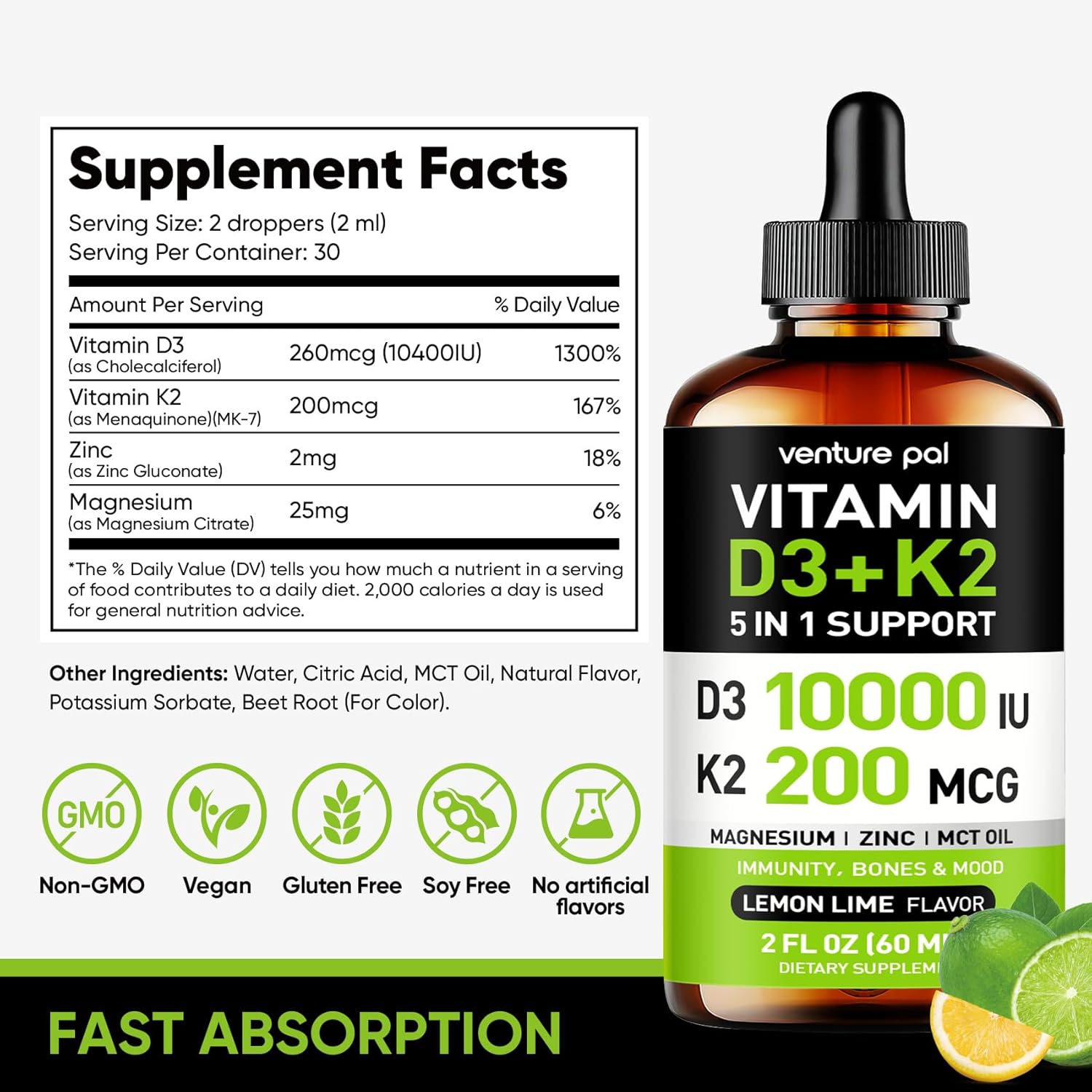 Venture Pal Vitamin D3 10000 IU Plus K2 (MK-7) 200 mcg Liquid Drops | Magnesium, Zinc, MCT Oil |Maximum Absorption for Bone, Mood & Immune Health (Lemon,2 Fl Oz)