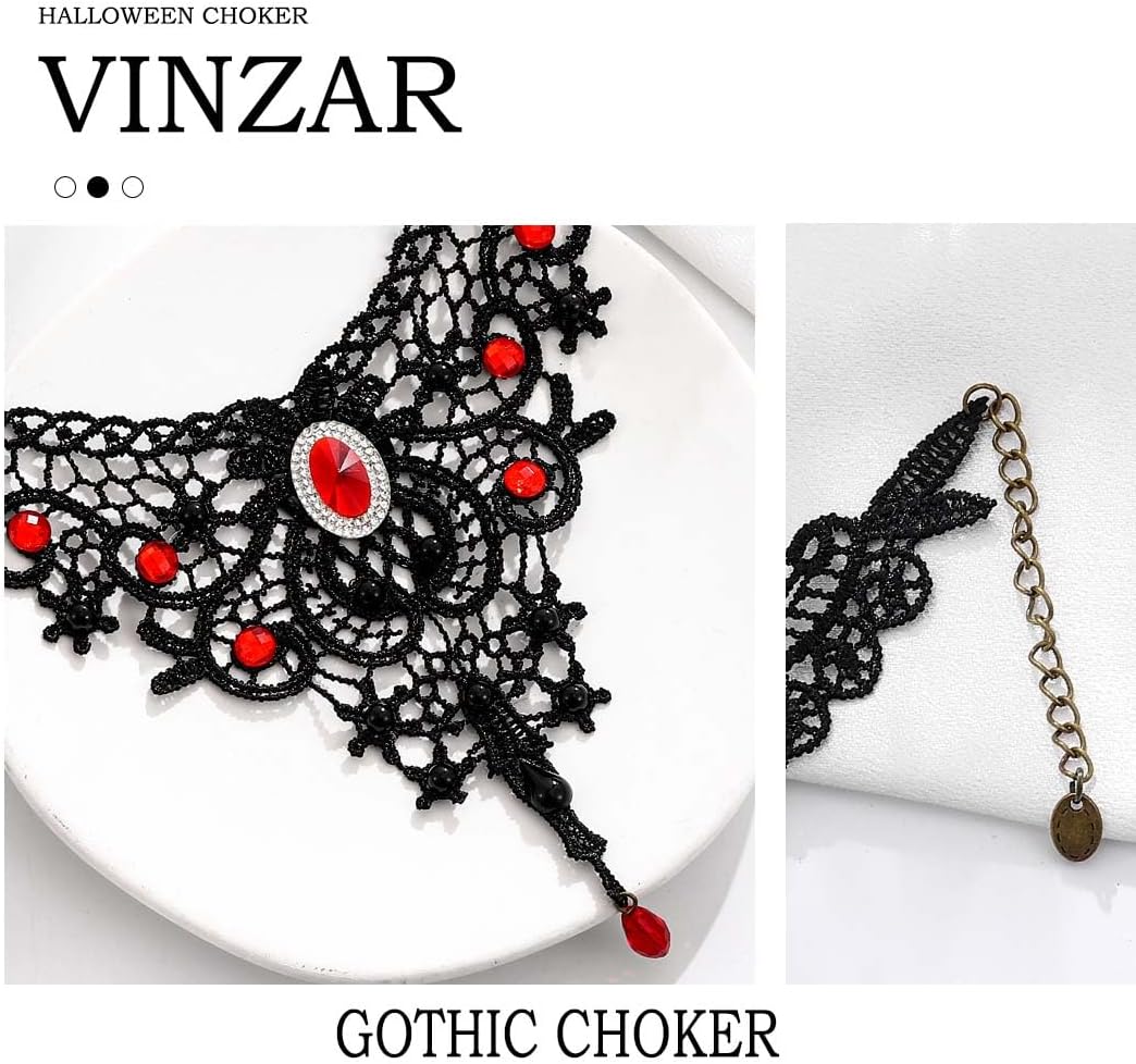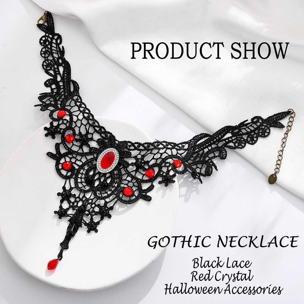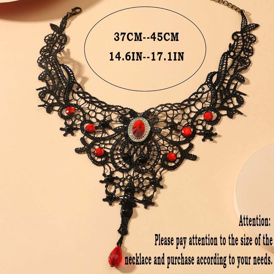 Vinzar Gothic Black Lace Choke Necklace Red Crystal Pendant Necklace Women Collar Necklace for Prom Costume Party Cosplay