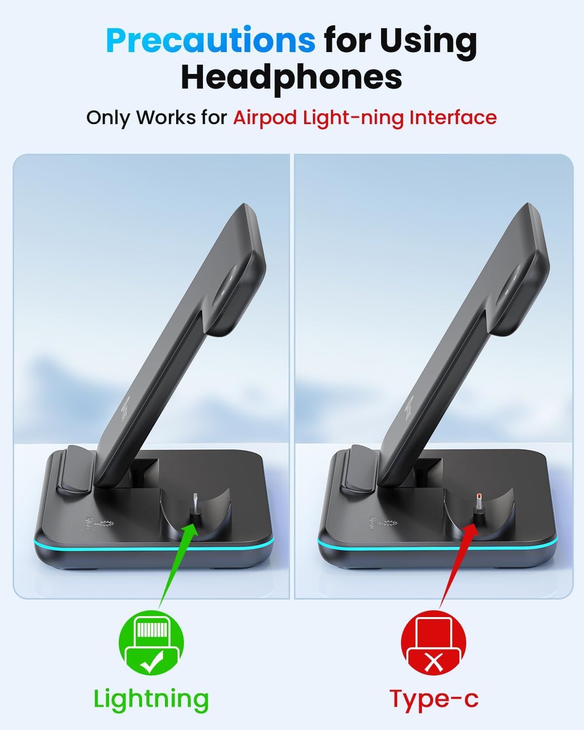 【Breathing Light On/Off】:This 3 in 1 wireless charger station for apple has a touch button sensor which turns the light on/off.The blue breathing light when the phone is charging;the blue and green lights flash if there are foreign objects;the green light is always on in the standby state.If a common 5V adapter is used, the wireless charger station will flash green light in standby mode.(Note:Please use a mobile phone case with a thickness of less than 4mm/0.16in).
