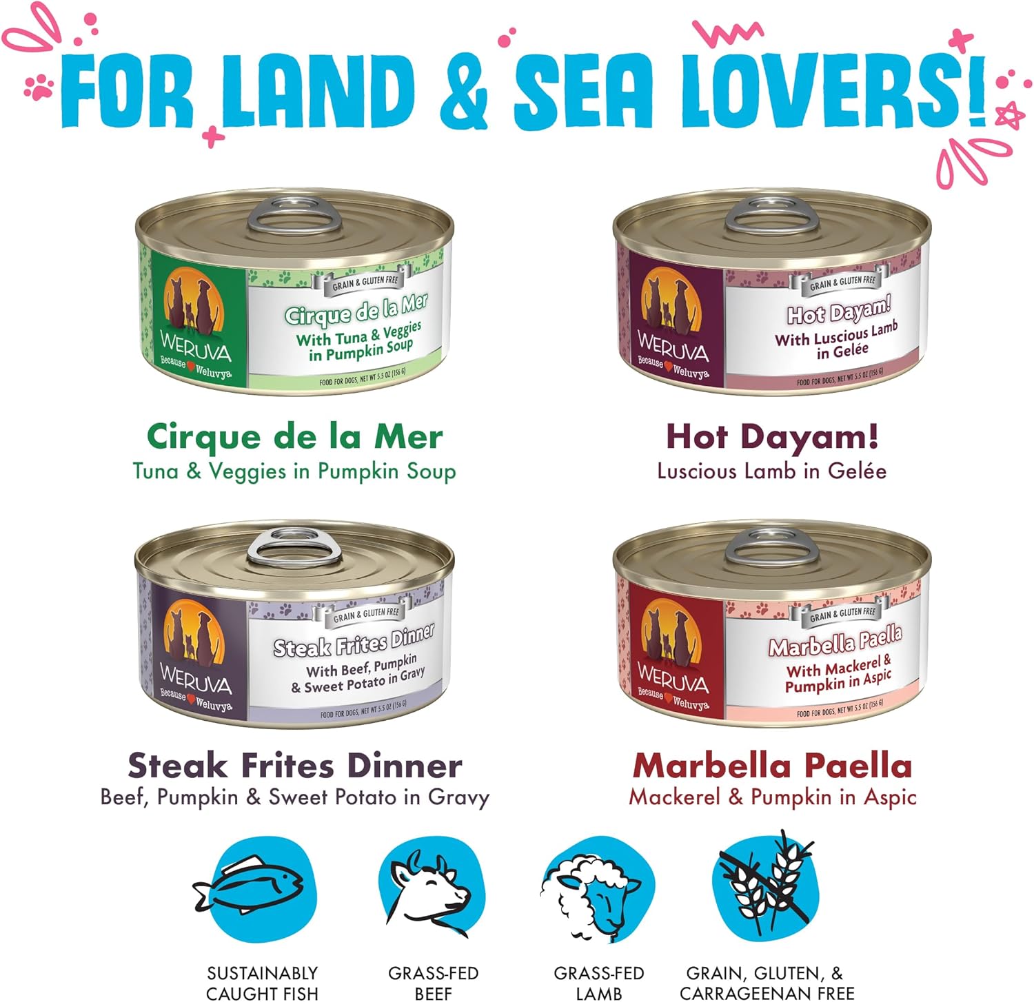 Chicken Free, Just 4 Me!, a Variety Pack with four (4) poultry-free Weruva recipes – 24 pack of 5.5oz wet canned dog foods, including Steak Frites Dinner, Hot Dayam, Marbella Paella & Cirque de la Mer (6 of each 5.5oz can). All of the grain-free recipes in this variety pack have limited ingredients and do not contain chicken, duck or turkey. Two recipes feature wild-caught sustainable fish and the other two red-meat recipes include grass-fed beef and grass-fed lamb. Awesome Healthy, Awesome Happy – Welcome to Weruva Grade!