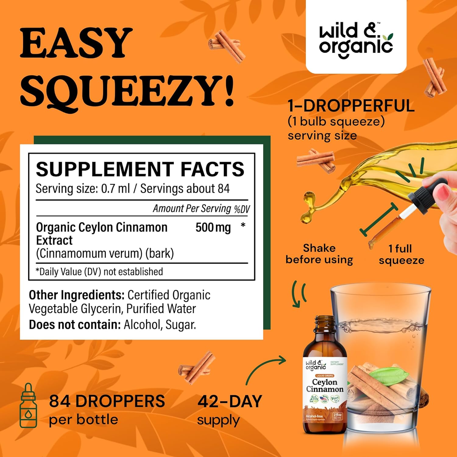 Overall Support: Each serving of Wild & Organic Ceylon cinnamon tincture contains 500 mg of pure cinnamon extract for overall well-being.