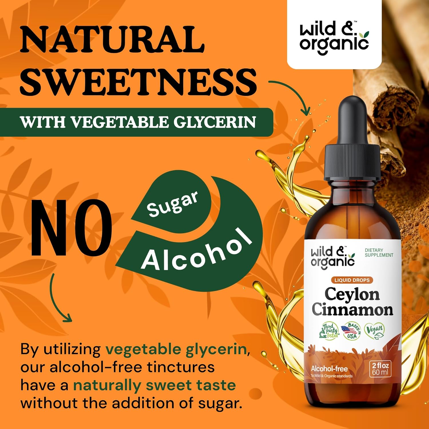 Alcohol-Free: Wild & Organic cinnamon supplements are vegetable glycerin-based, providing an alcohol-free tincture that is easy on digestion.