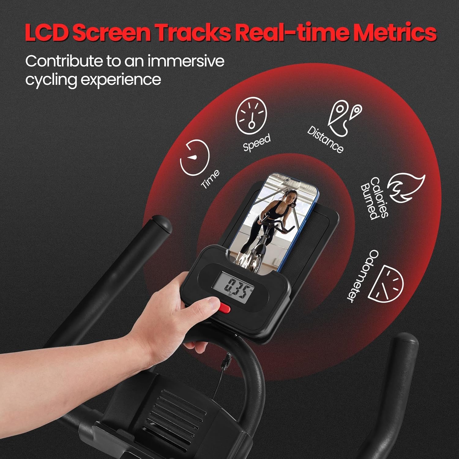 Built-in LCD Screen: The LCD screen on the handlebars of this indoor cycling bike tracks Time, Speed, Distance, Calories Burnt, and Odometer in real-time, making it easy to monitor workout performance and optimize your exercise routine